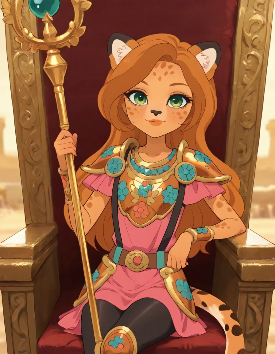 CC_E1, tan skin with cheetah spots on her forehead and cheeks, green eyes, a black nose, whiskers, orange lips, and brown eyebrows, very long super-slim double caramel-type hair hangs around her cheetah ears and down to her hips, a long cheetah tail