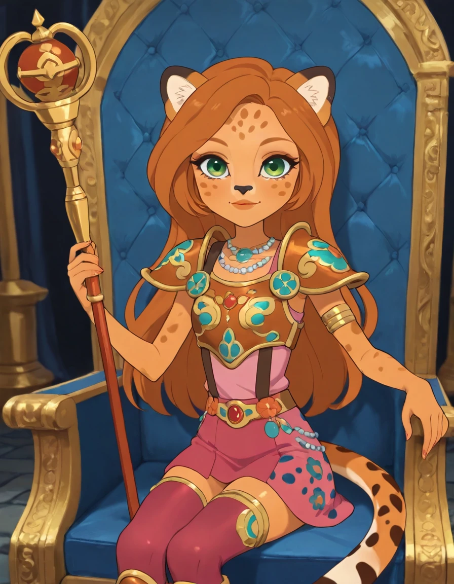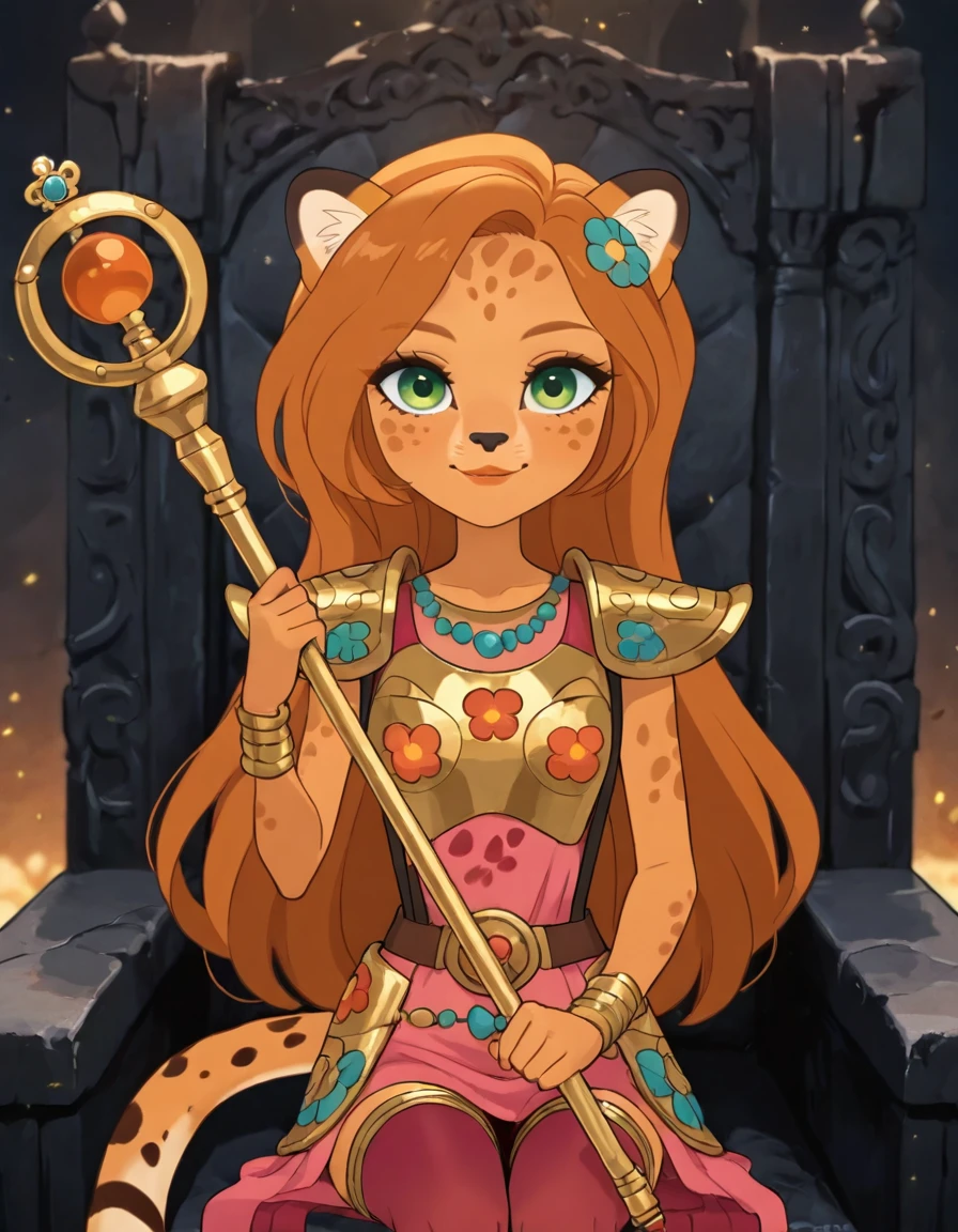 CC_E1, tan skin with cheetah spots on her forehead and cheeks, green eyes, a black nose, whiskers, orange lips, and brown eyebrows, very long super-slim double caramel-type hair hangs around her cheetah ears and down to her hips, a long cheetah tail, wearing a pink dress with cheetah spots on it, bodice has one from the middle that is covered in green, orange, pink, yellow, and blue flowers, skirt portion of the dress with a same pattern as the bodice and the same color of flowers scattered across the skirt, augmented by orange fur corners, pink shoes with cheetah pattern molded in the shoes and pink socks, yellow flower molded onto her left ear and a necklace made of gems painted onto her bodice