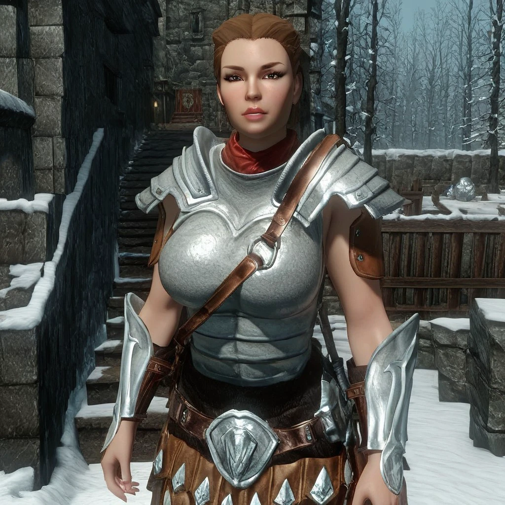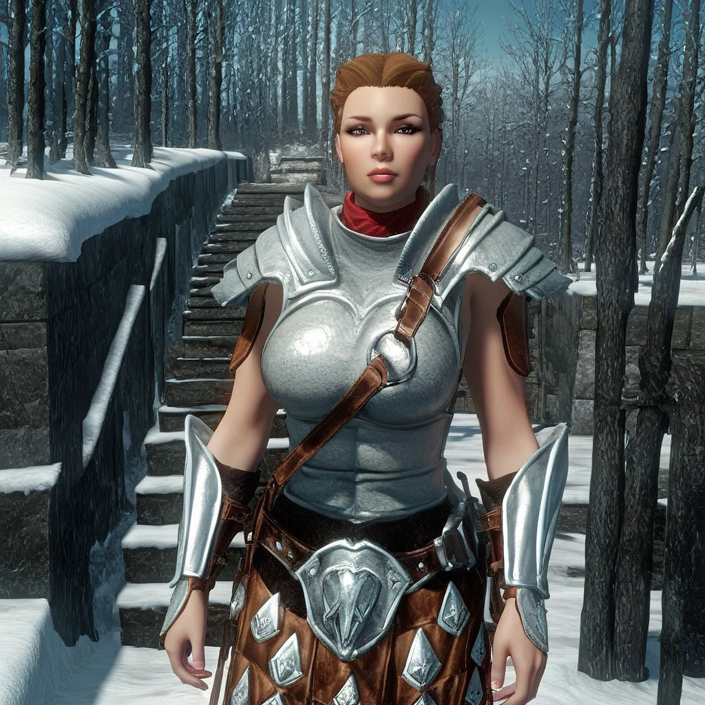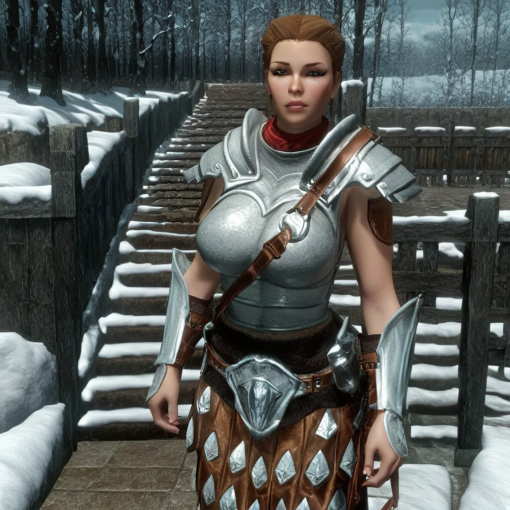 1girl, solo, big breasts, brown hair, breastplate, armor, pauldrons,