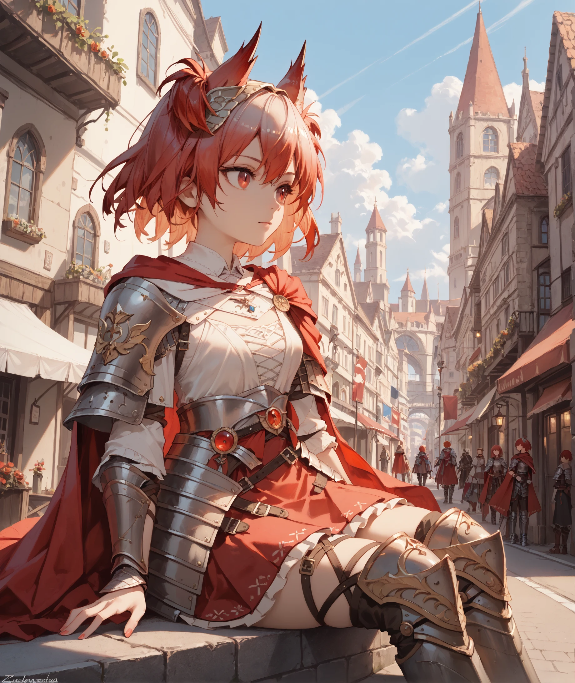 white shirt, red skirt, armored boots, shoulder armor, armor, cape