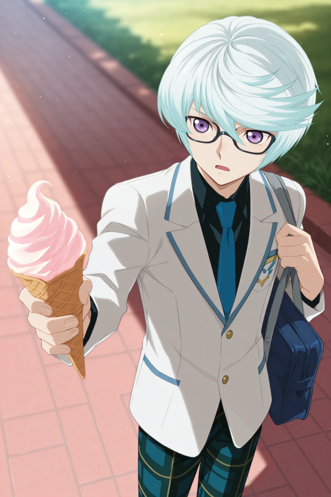 -glasses, school uniform, white blazer, black shirt, blue necktie, plaid pants