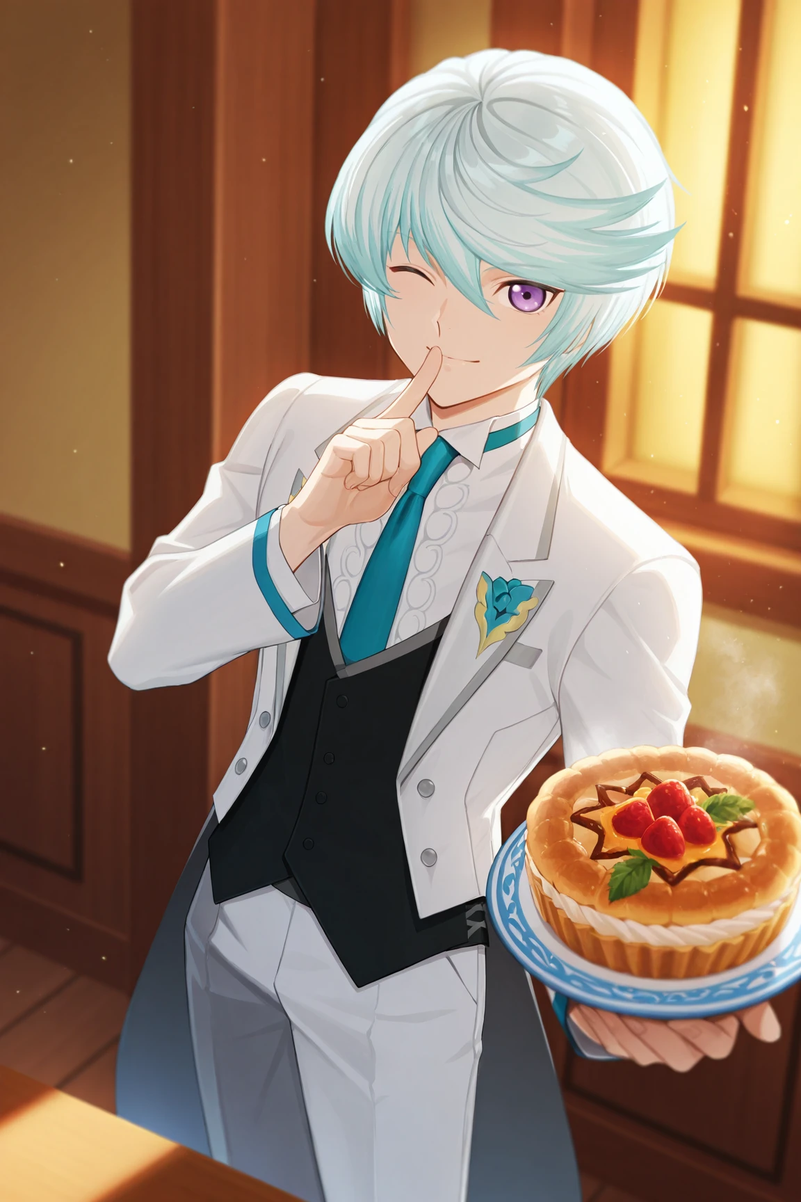 -formal, white jacket, white shirt, green necktie, black vest, white pants