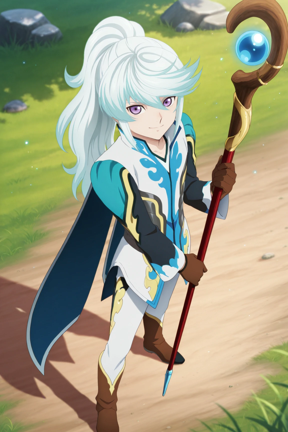 -long hair, ponytail, multicolored jacket, black shirt, brown gloves, white pants