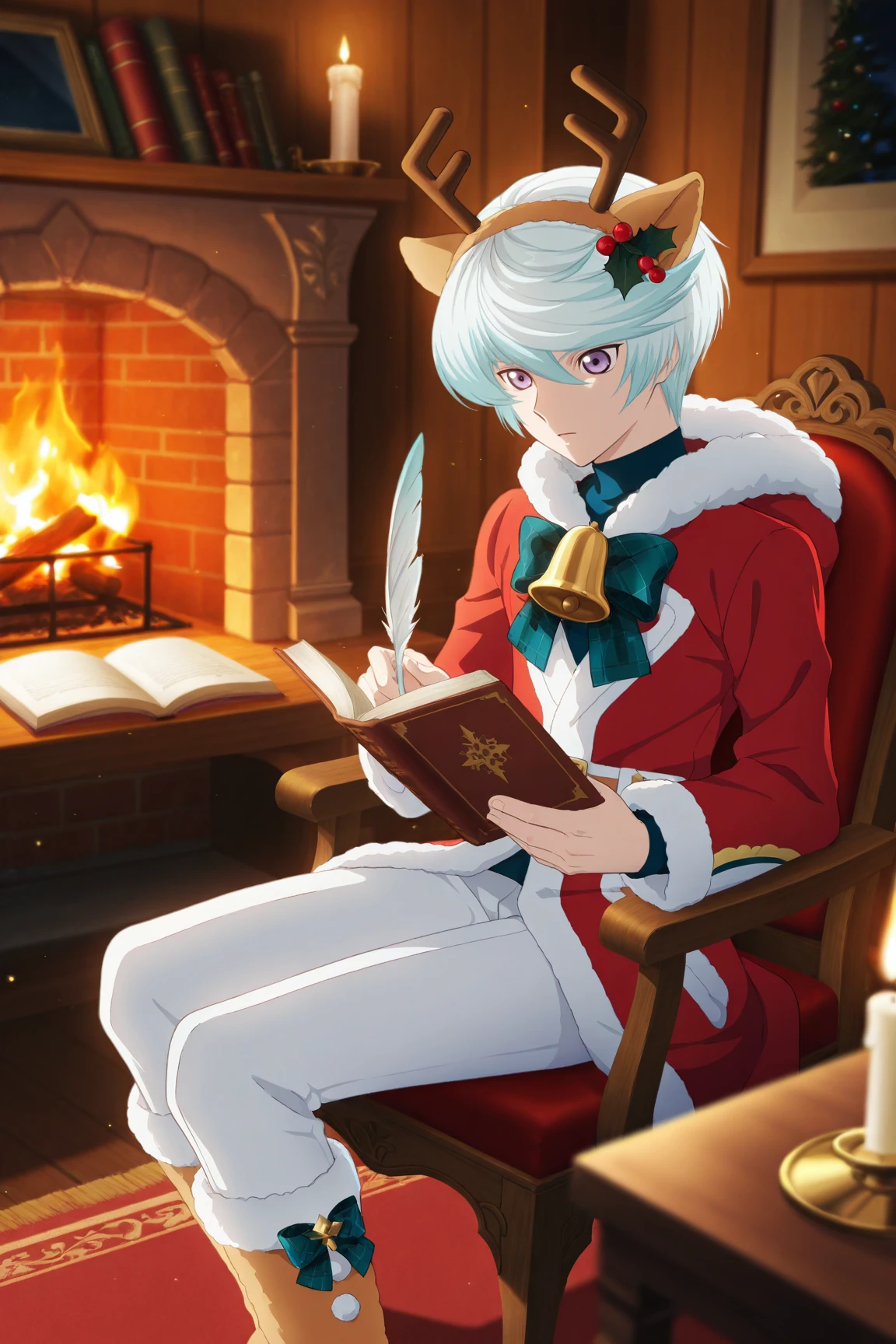 -fake antlers, fake animal ears, fur-trimmed coat, red coat, green bow, bell, white pants, fur trimmed boots