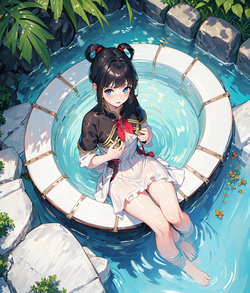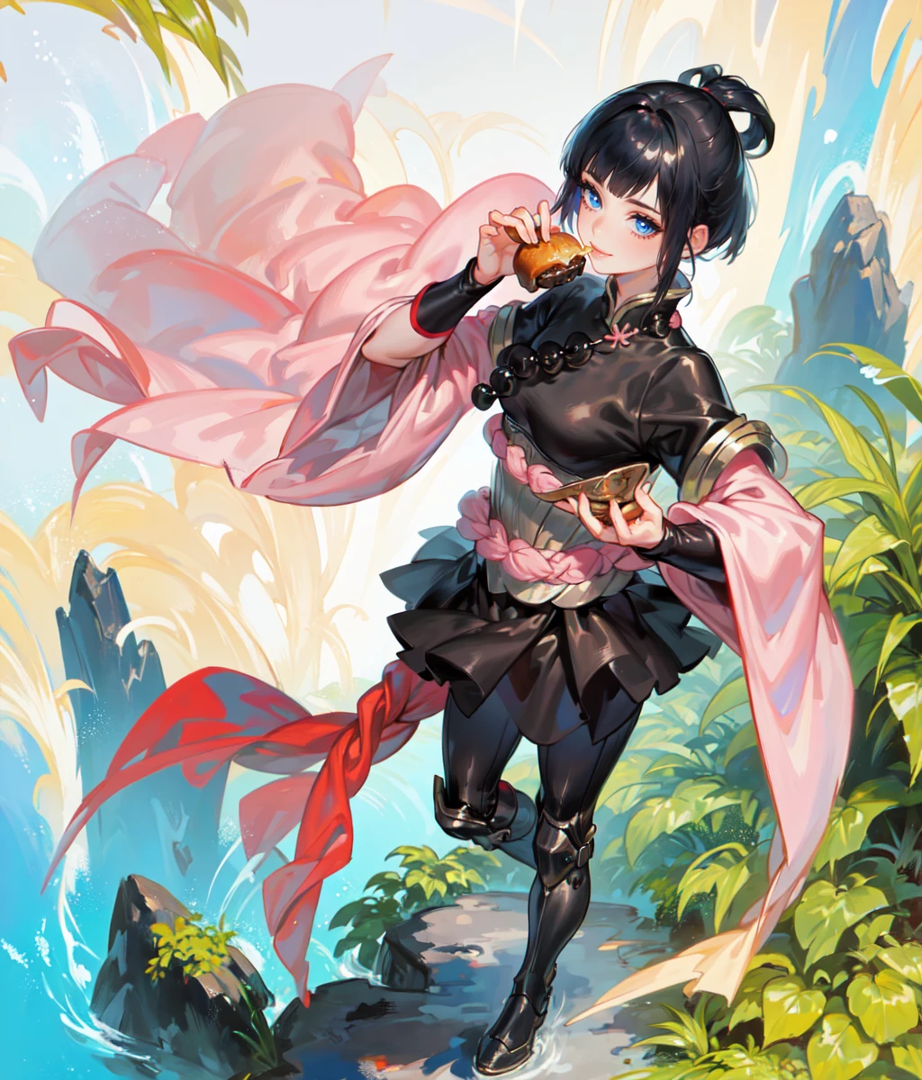 Notable tags: black hair, top knot, blue eyes, short hair, black gold outfit, pink sleeves