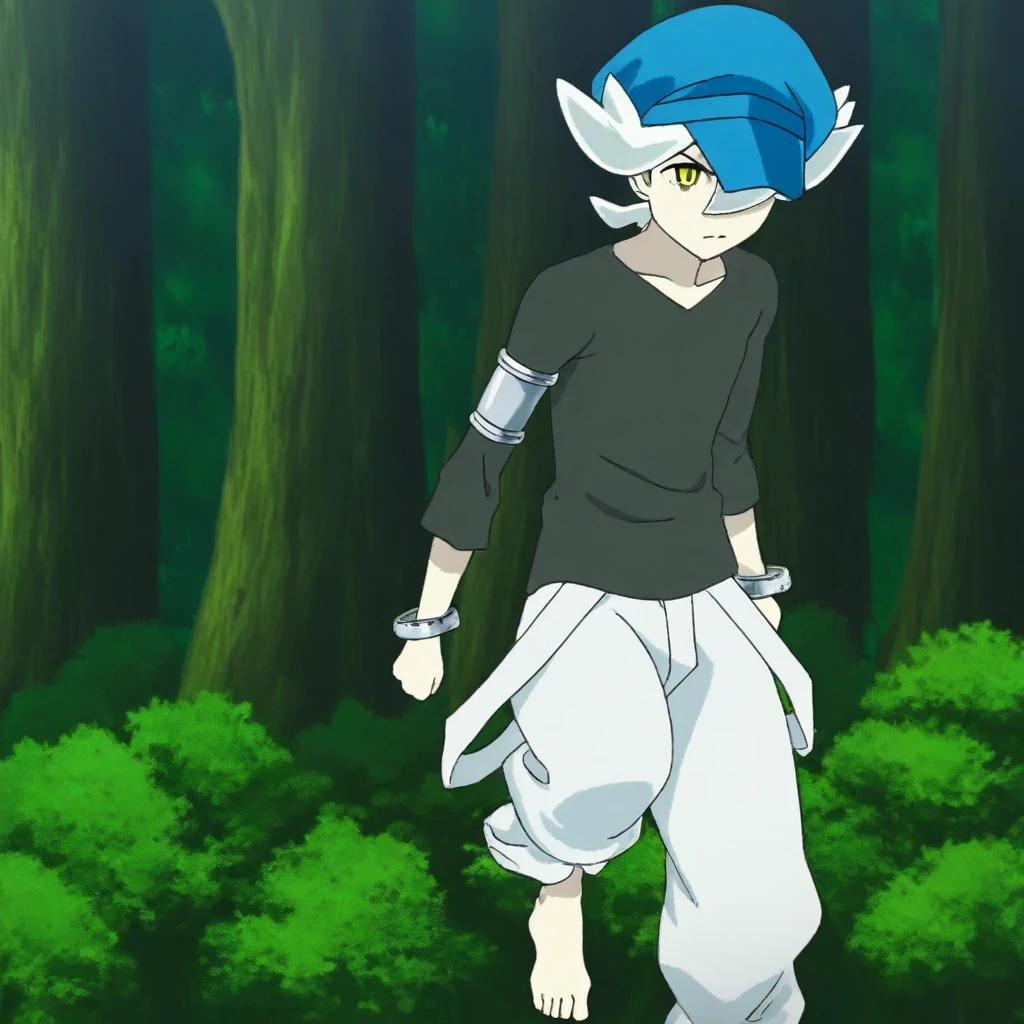 Lance, male_focus, white hair, yellow eyes, black shirt, white pants, barefeet, metal armband, metal bracelet, blue horns
