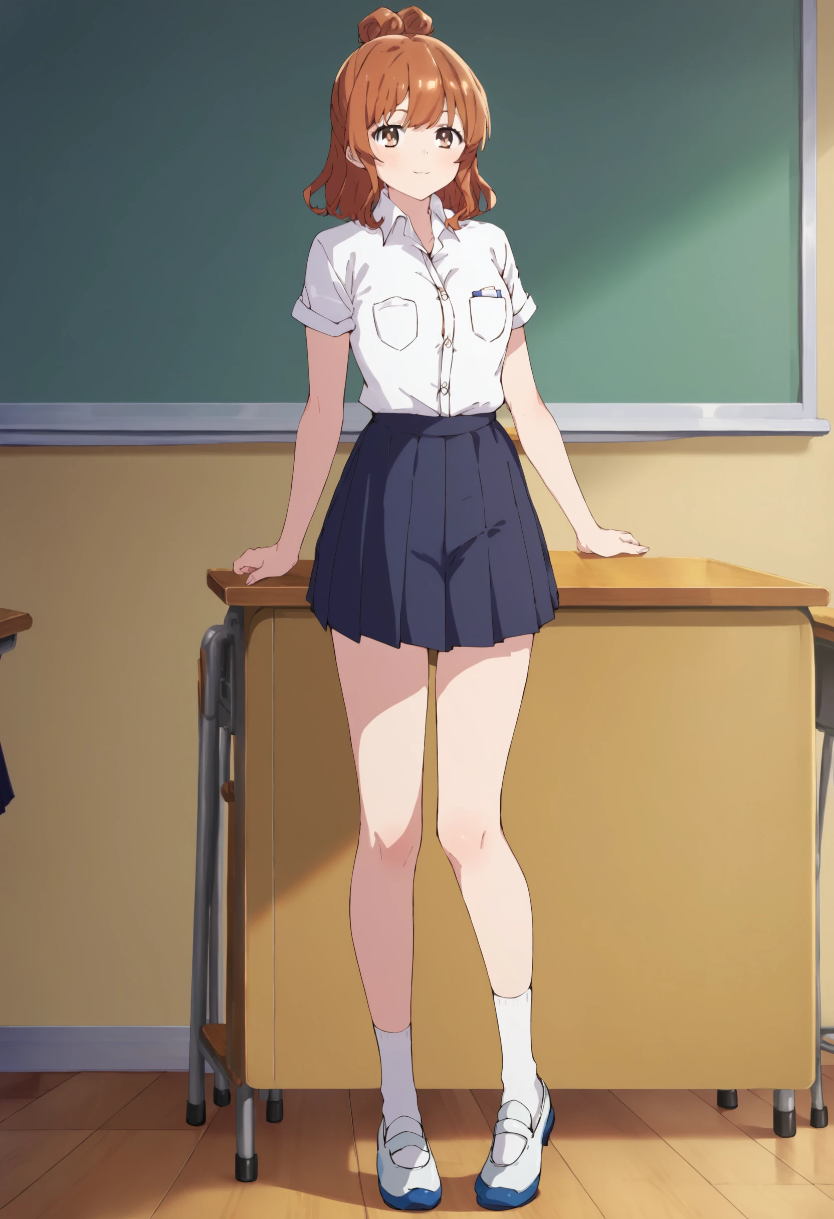School uniform: white shirt, collared shirt, blue pleated skirt, breast pocket, shoes, hair bun, short sleeves, | cardigan,