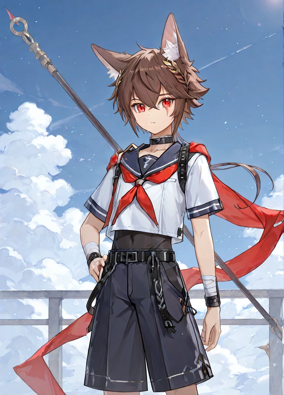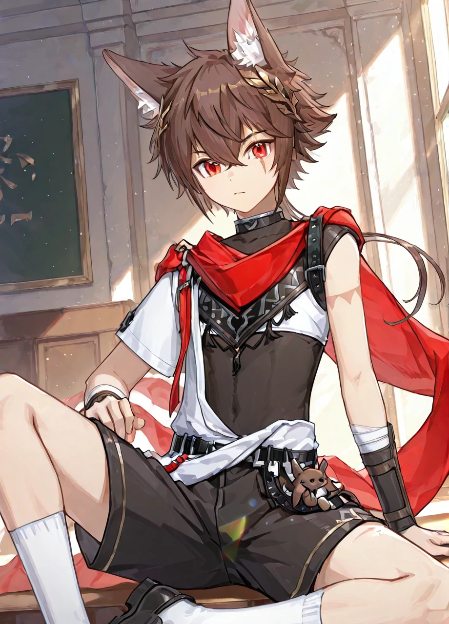 red eyes, scarf, animal ears, hair between eyes,brown hair,