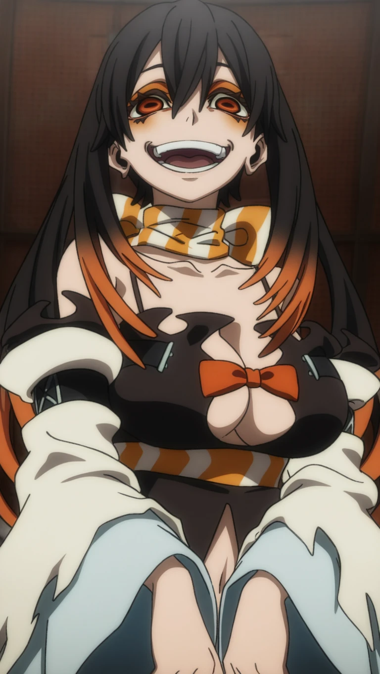 4m0, orange eyes, orange eyeshadow, orange and black hair,