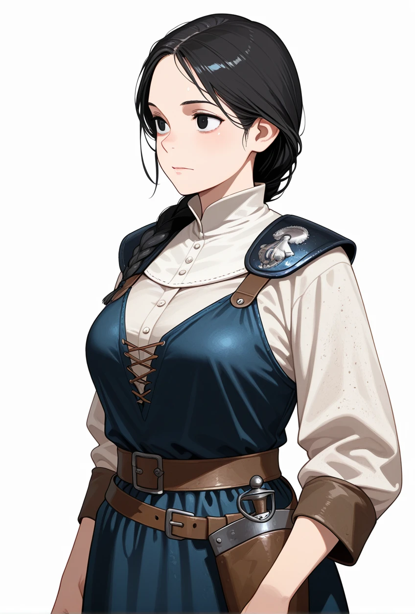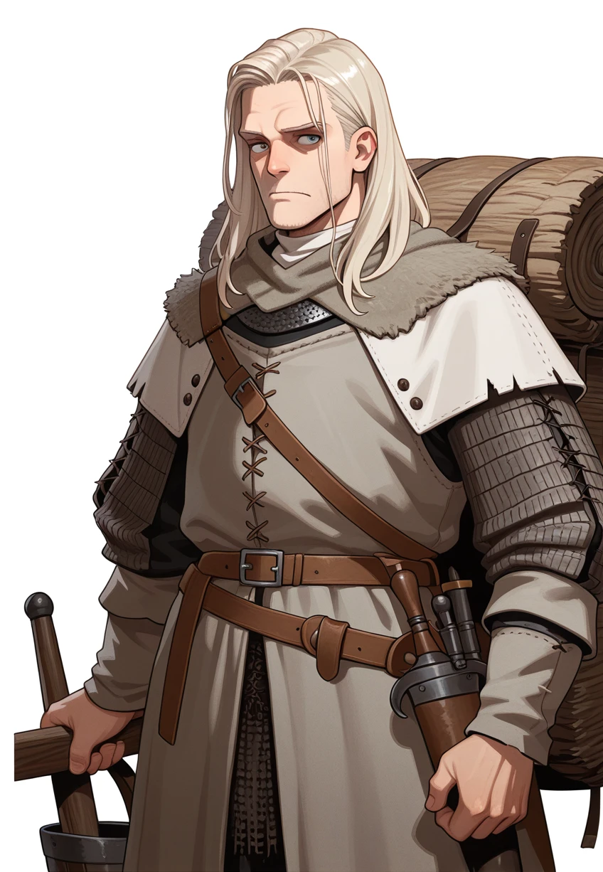 1girl, platinum blonde hair, medieval outfit, shepherd, (american shot), white background, best quality, amazing quality