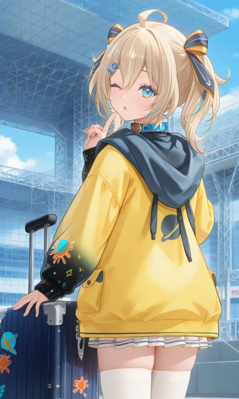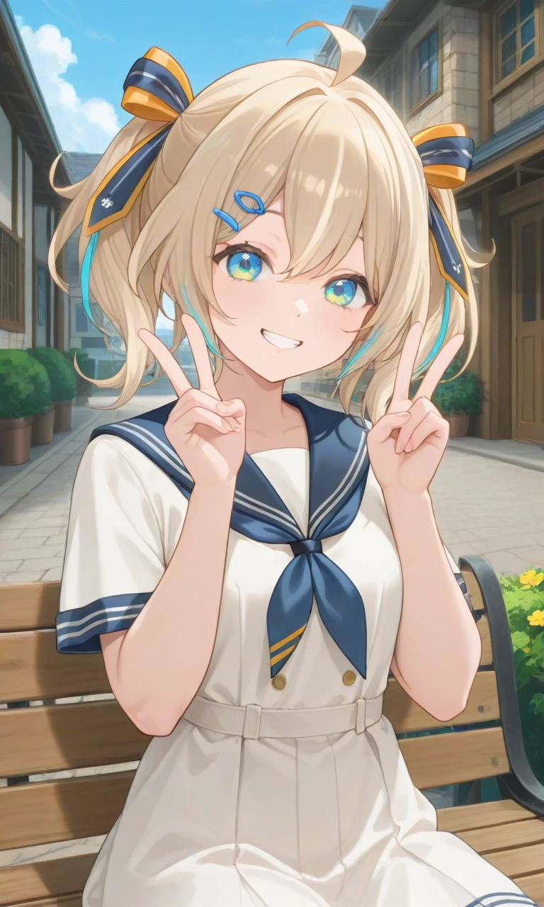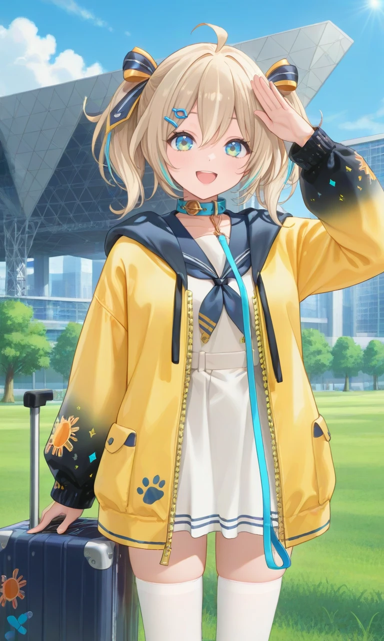 🌟Default outfit : appare hinata, twintails, ahoge, hairclip, hair ribbon, collar, leash, yellow jacket, hooded jacket, white dress, sailor collar, blue neckerchief, sailor dress, white thighhighs