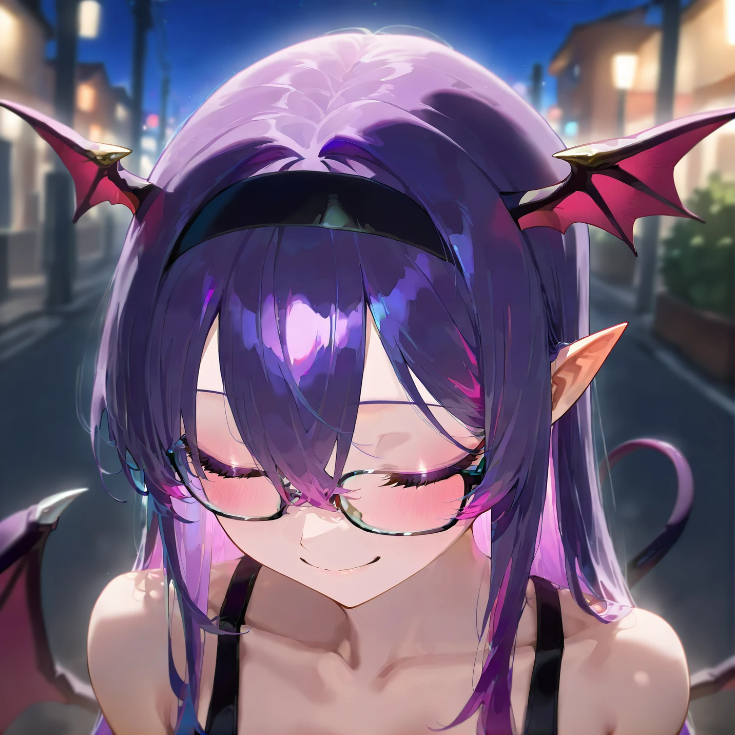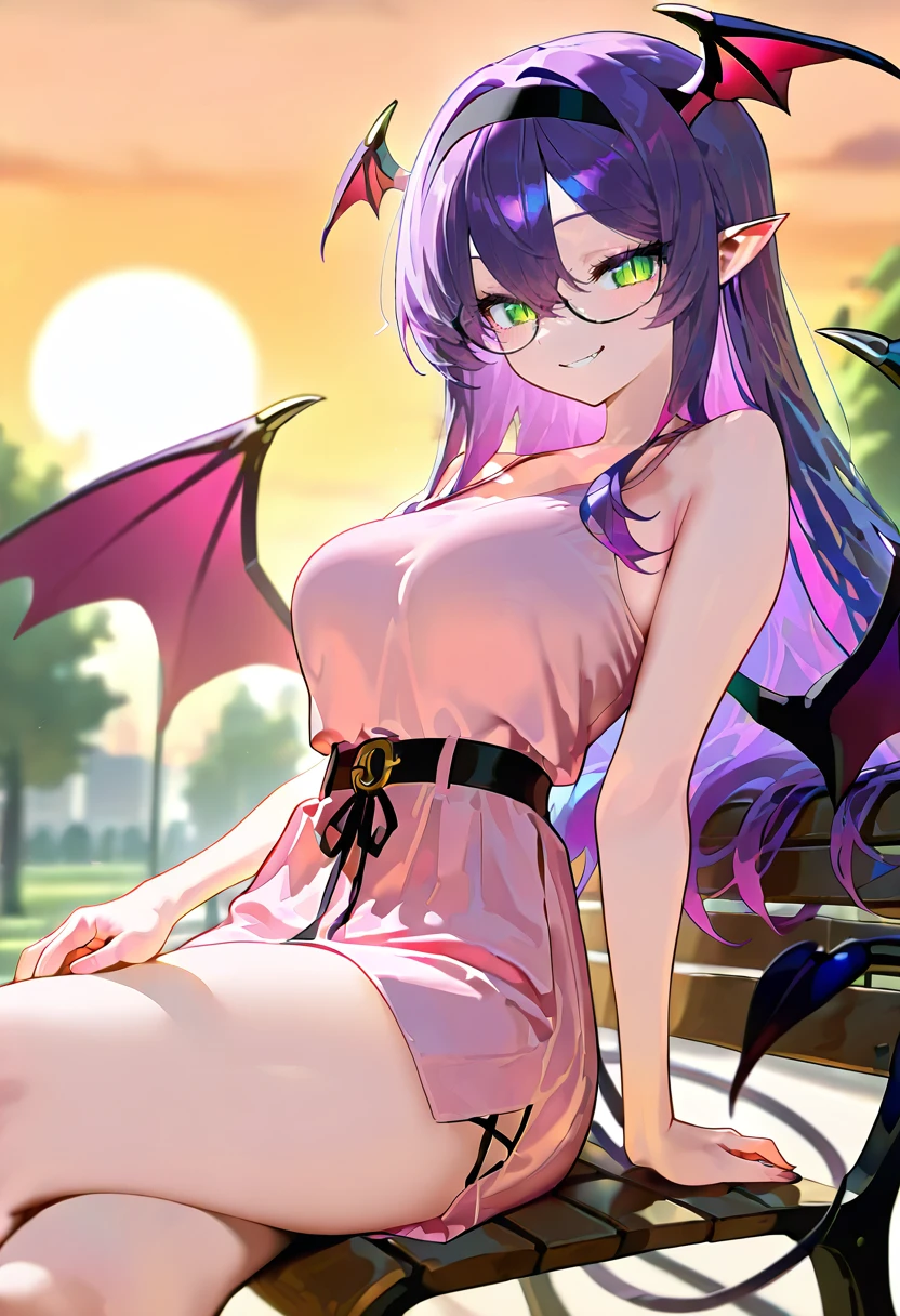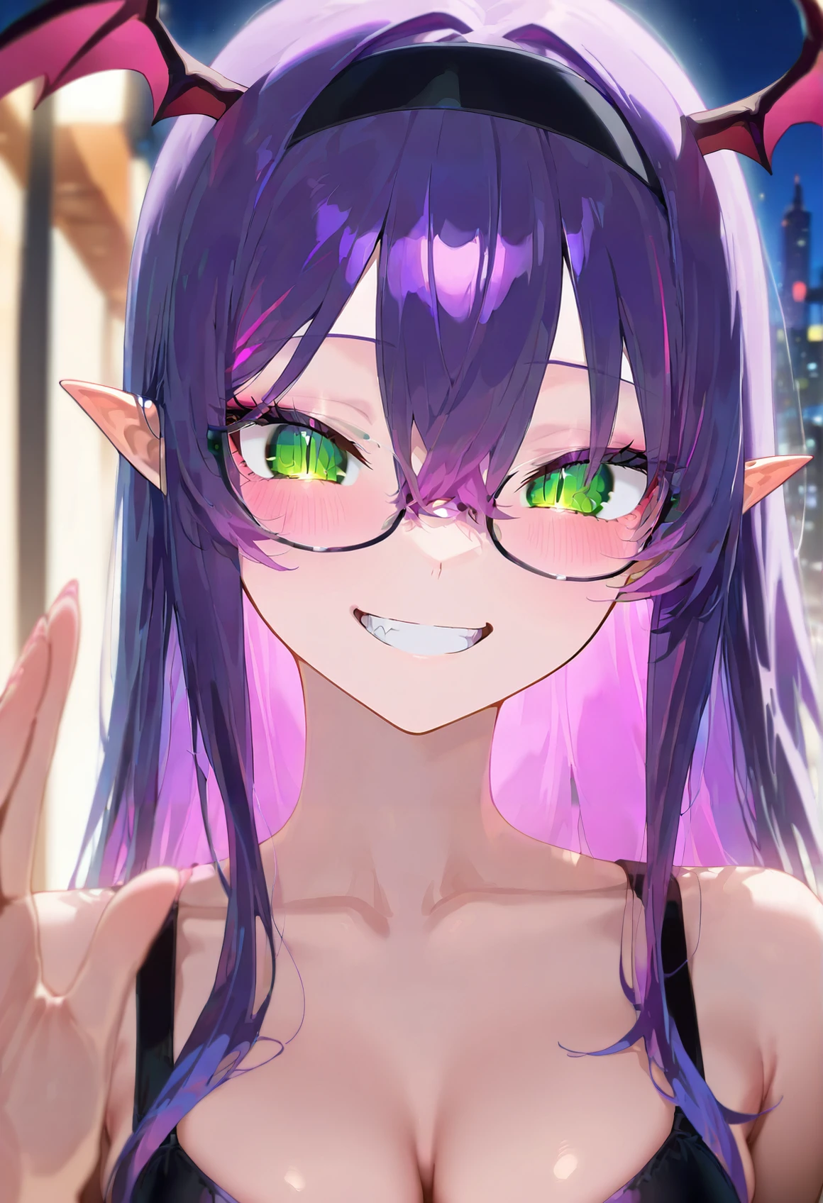 Lina Purple, purple hair, green eyes, cat slit pupils, succubus girl, glasses, succubus tail, (((adult))) medium breasts