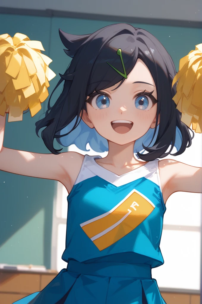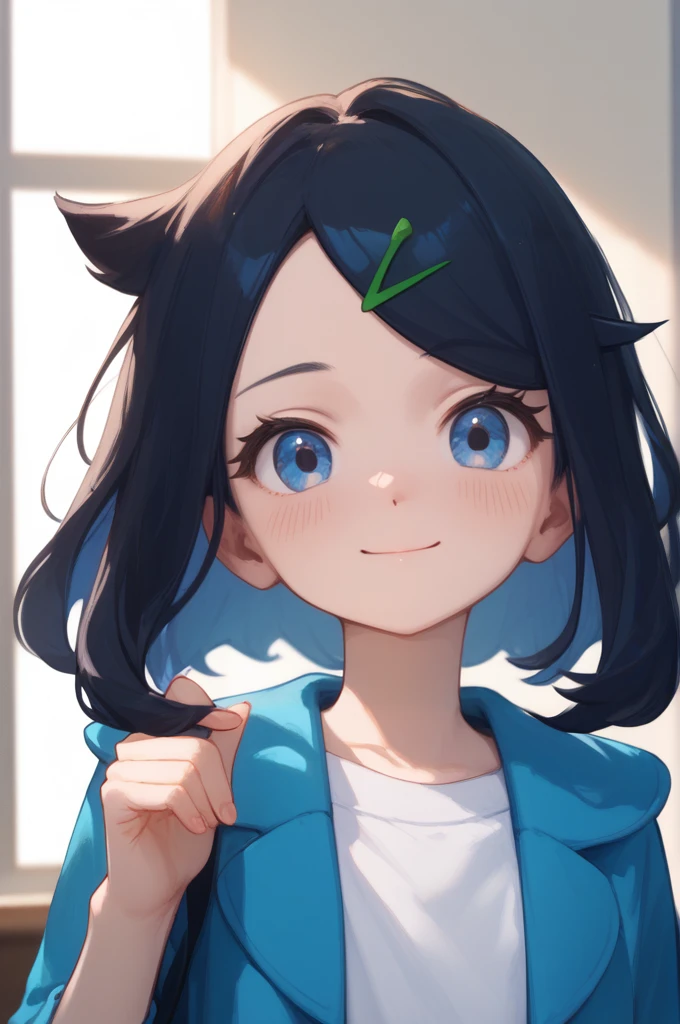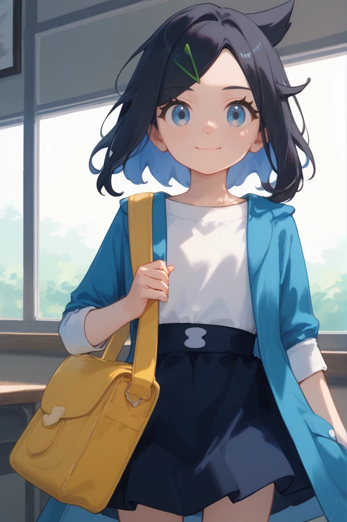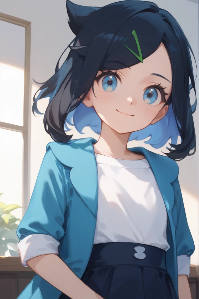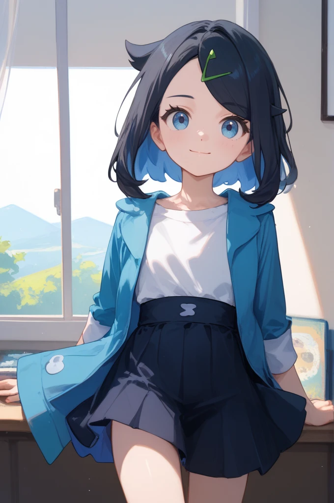black hair,hair ornament,hairclip,short hair,blue eyes,blue jakcet,white shirt,skirt,