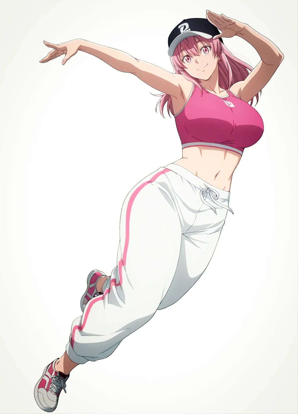 homare02, 1girl, solo, pink hair, hat,navel, sweatpants, pants, large breasts, midriff, pink eyes, long hair, white pants, crop top, sports bra, black headwear, baseball cap,thick thighs,sneakers,