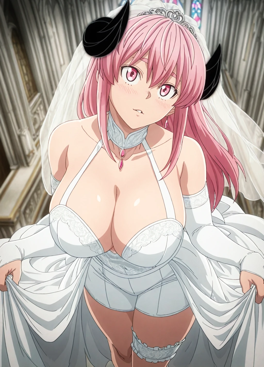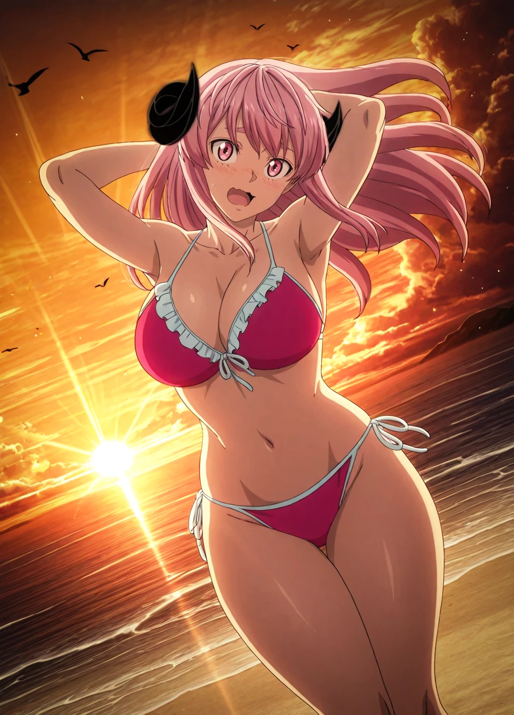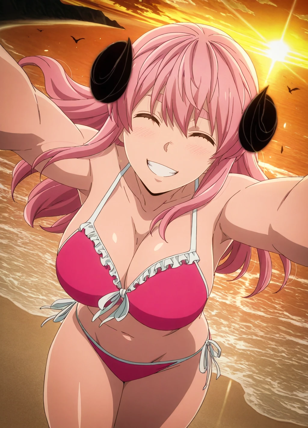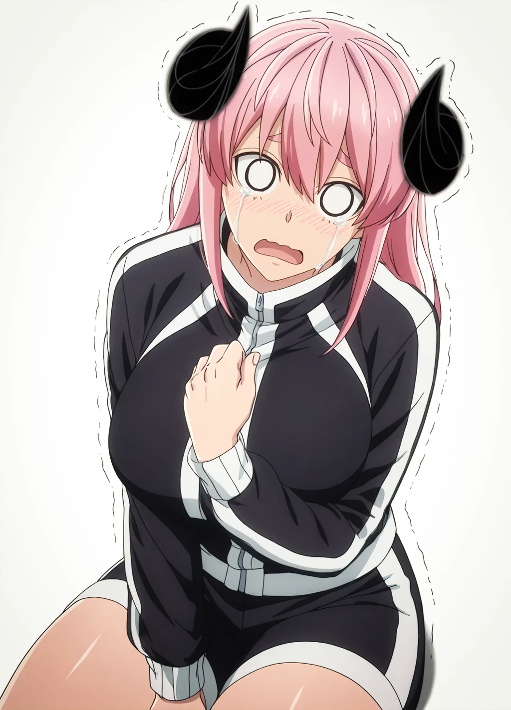 homare01, 1girl, solo, pink hair,shorts, jacket,track jacket, long hair, pink eyes, large breasts, black shorts, long sleeves, black jacket,cross-laced footwear,boots,demon horns,curled horns,thick thighs,