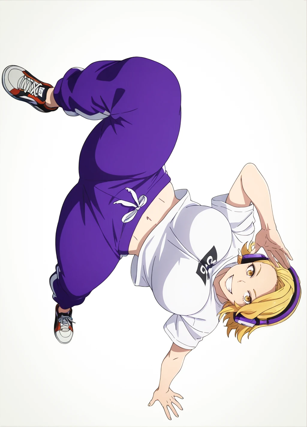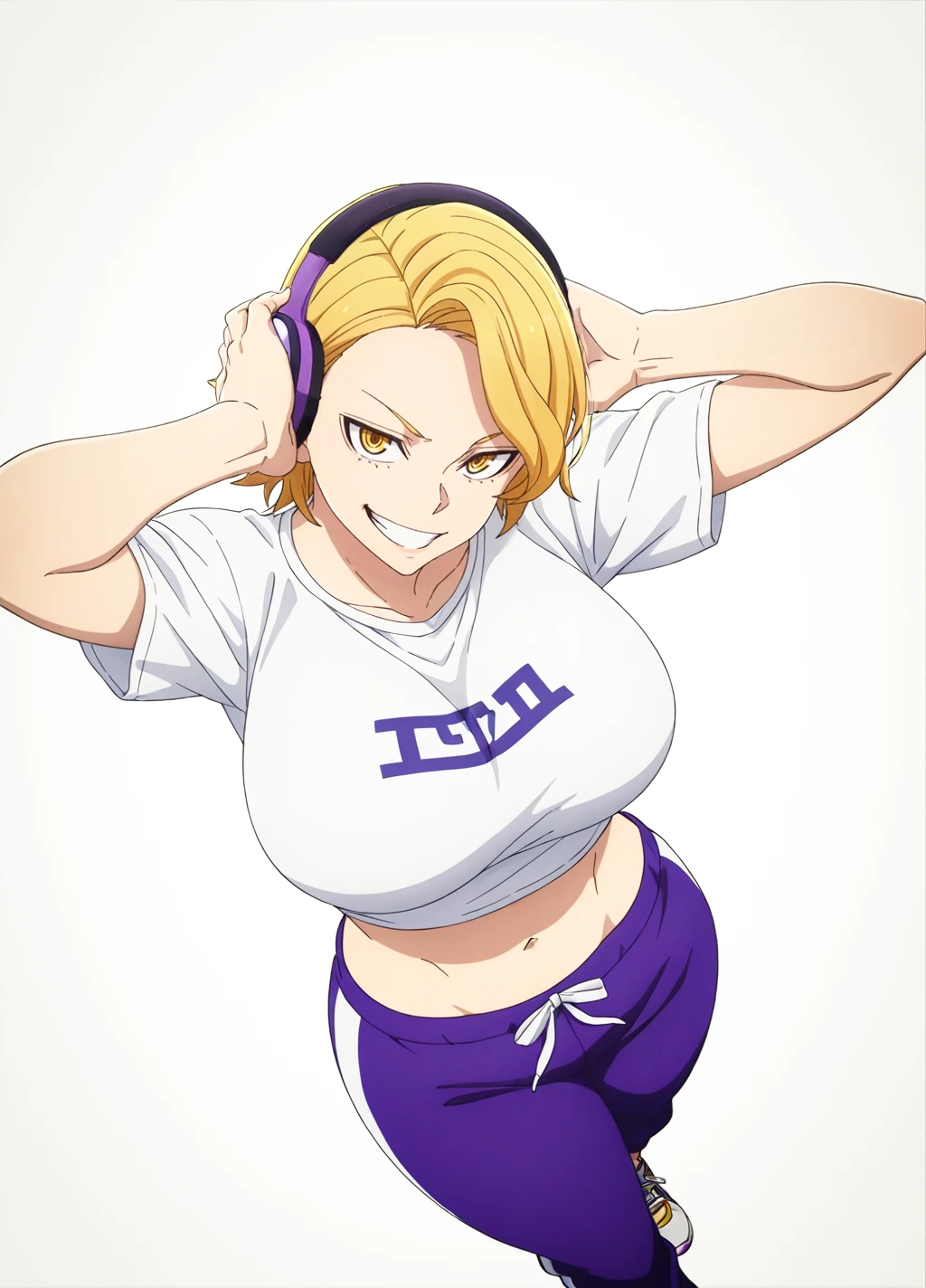 kuina02,solo, headphones, blonde hair, pants, shirt, white shirt, sneakers, purple pants, shoes, navel,sweatpants, grin,midriff, 1girl, large breasts, thick thighs,