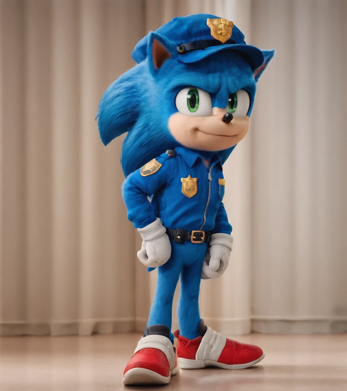 white gloves, blue body, green eyes, big head, red shoes, short tail