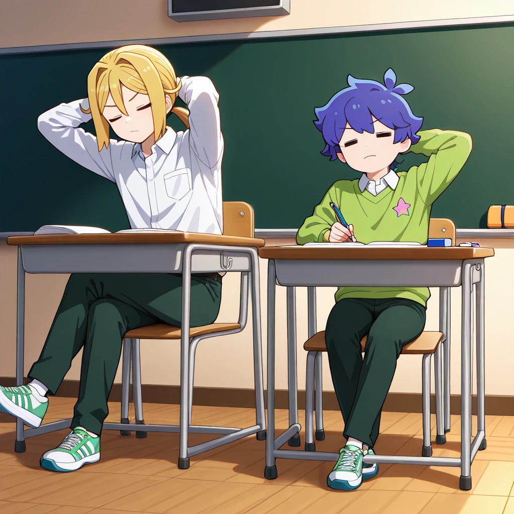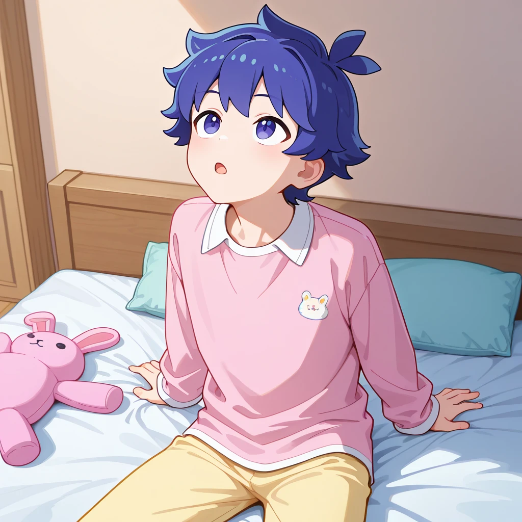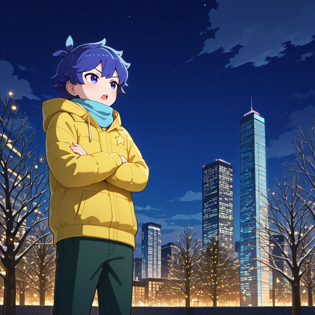 Kotaro Kawaii,white collared shirt,green-pink-star shirt,dark green pants,purple-white footwear/blue-white footwear,yellow-star hoodie winter coat,blue scarf,pajamas,pink shirt,yellow pants,Yusuke Nanpa