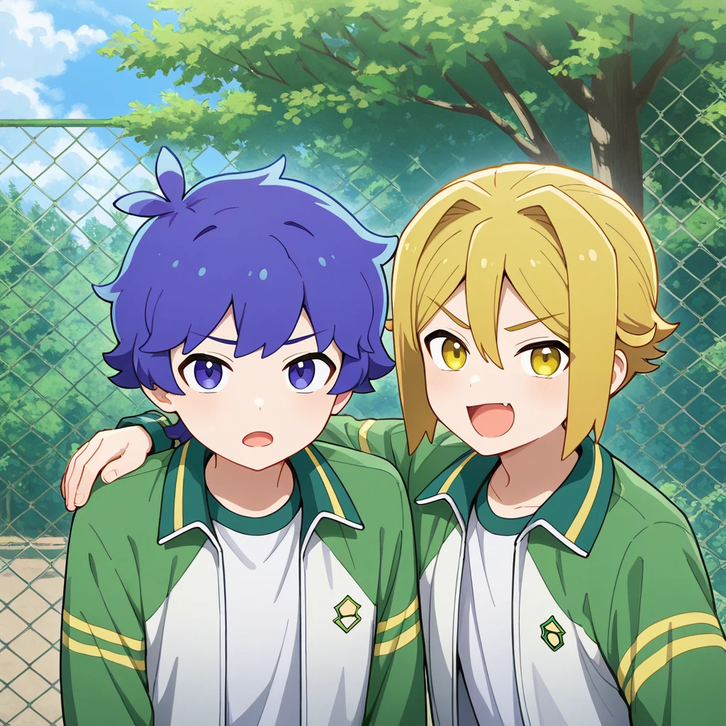 yusuke nanpa,white collared shirt,long sleeves,belt,dark green pants,orange footwear,green-white-yellow track jacket,green pants,track pants,track suitstyle