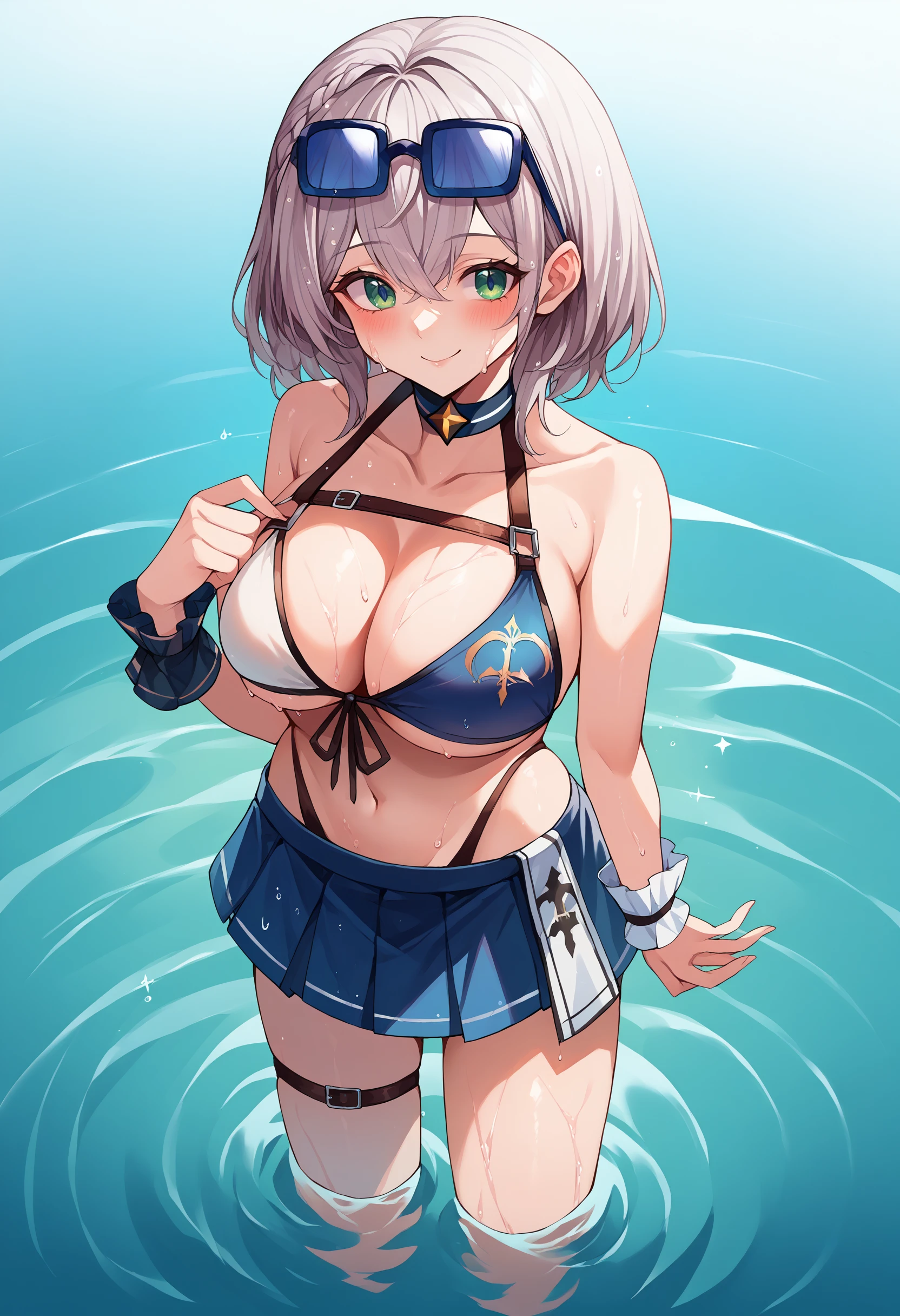 NoelBikini, short hair, braid, sunglasses on head, blue star choker, two-tone bikini, front-tie bikini top, chest belt, sleeveless, bare shoulders, highleg bikini, bikini skirt, thigh strap, wrist cuffsLet me know if you have any issues.