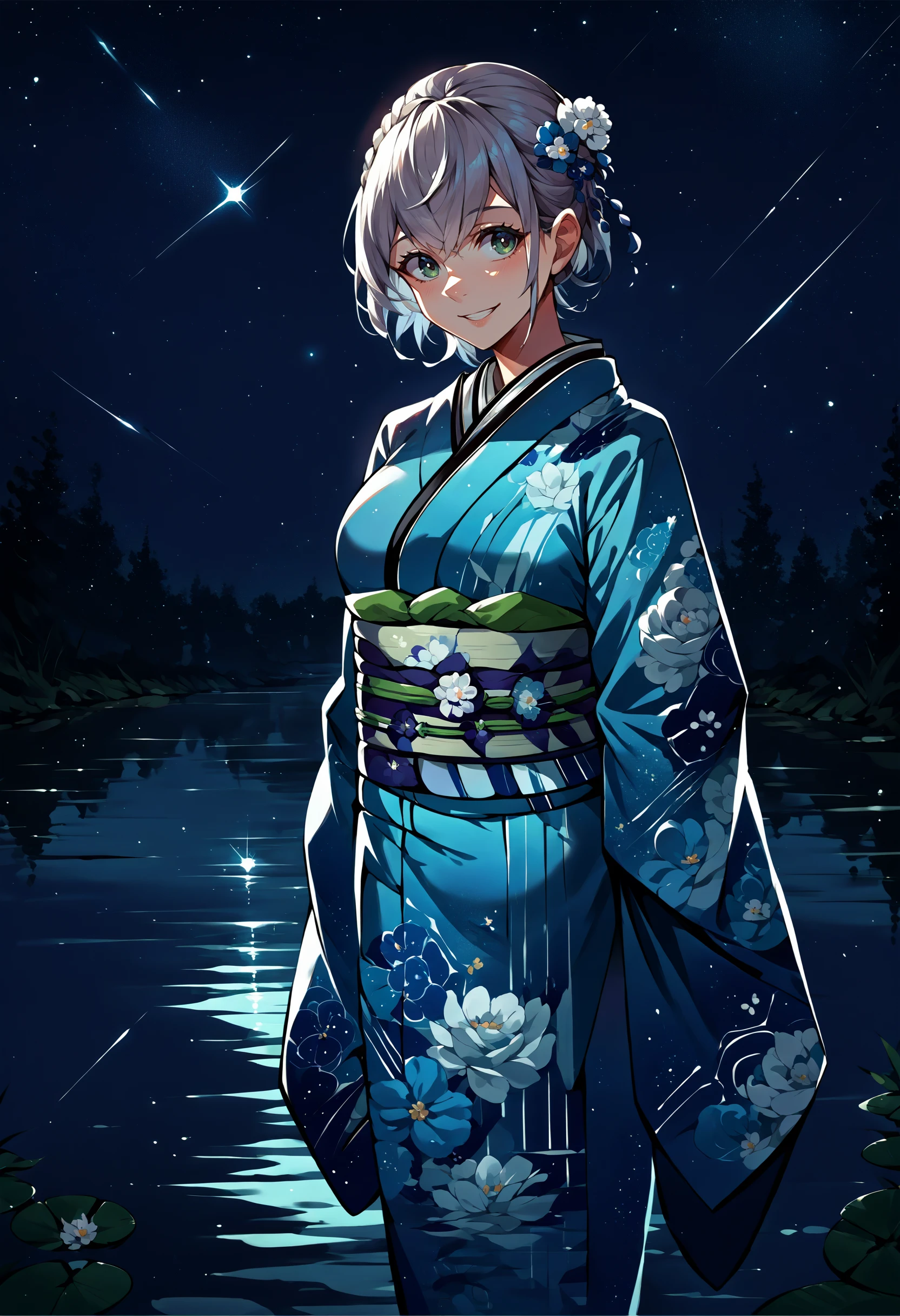 NoelNewYears, short hair, braid, hair flower, hair ornament, blue kimono, print kimono, floral print, sashCasual outfit: