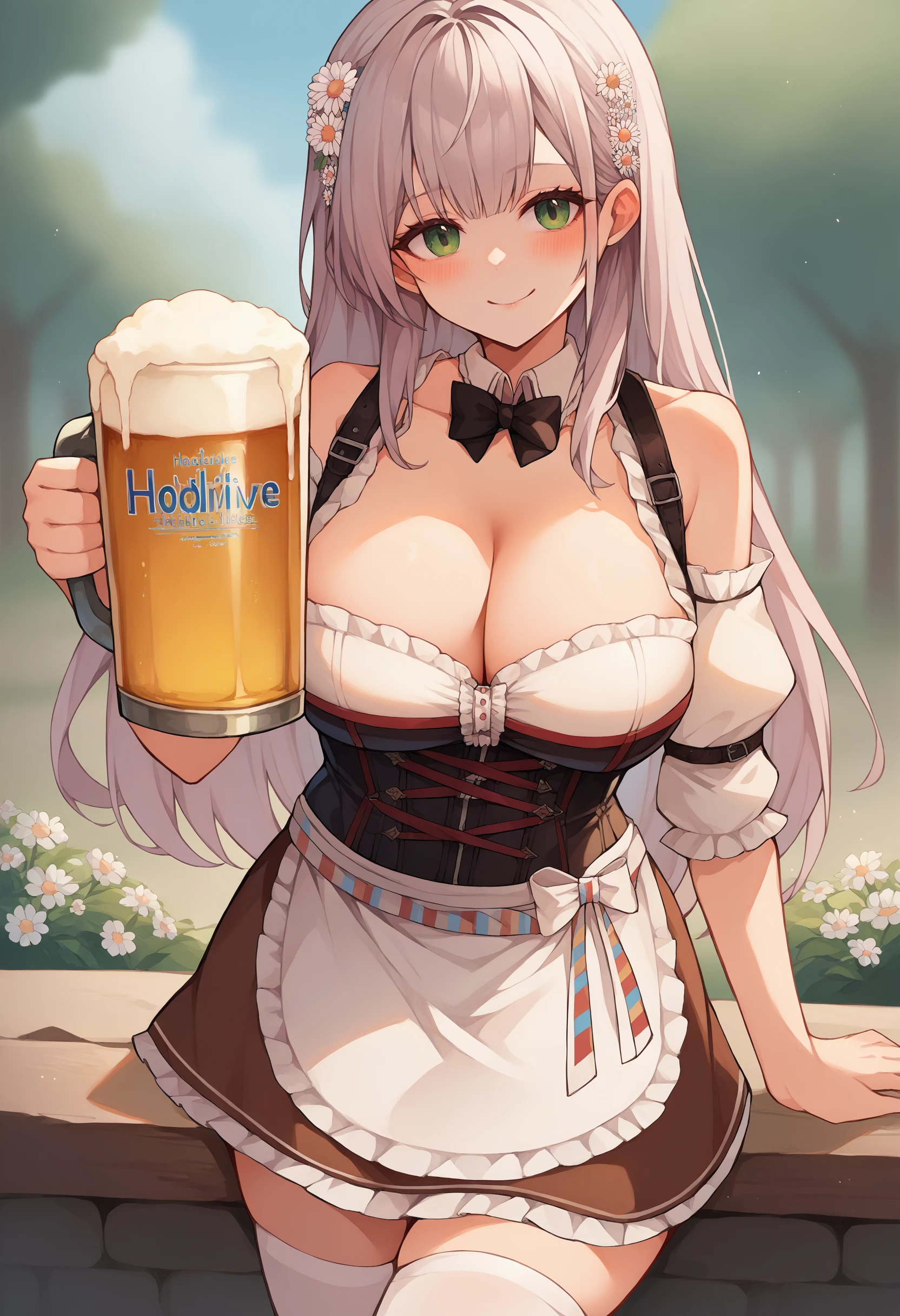 NoelDirndl, long hair, hair flowers, detached collar, black bowtie, dirndl, detached sleeves, black corset, cleavage, bare shoulders, waist apron, white thighhighs