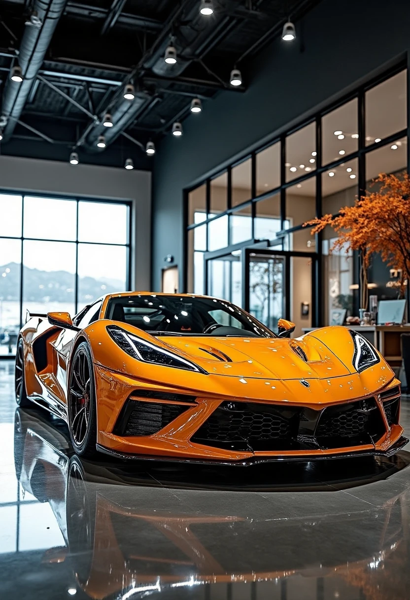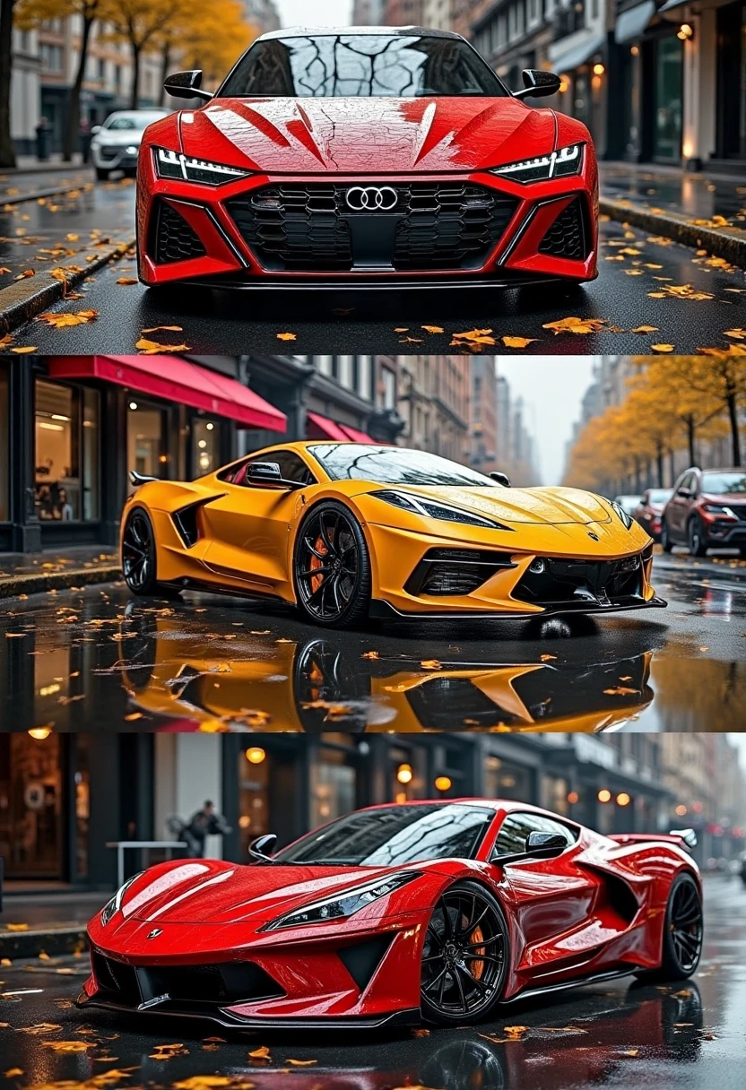 Supercars in various scenes, including city streets with autumn foliage, shiny showrooms, and wet roads reflecting vibrant colors, high detail, photorealistic.