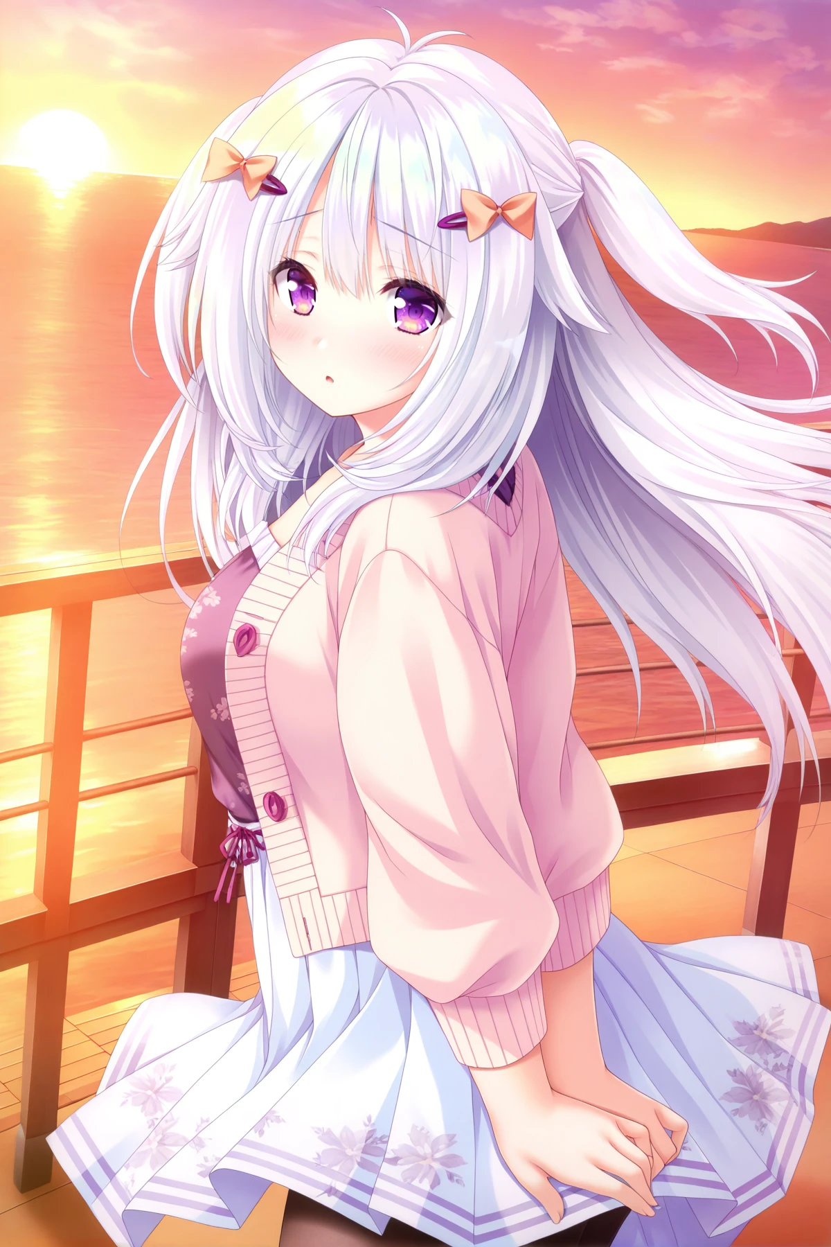 人物特征:ayane,1girl, purple eyes, bow, long hair, hair ornament, hair bow, antenna hair, white hair, hairclip, two side up, hair between eyes,