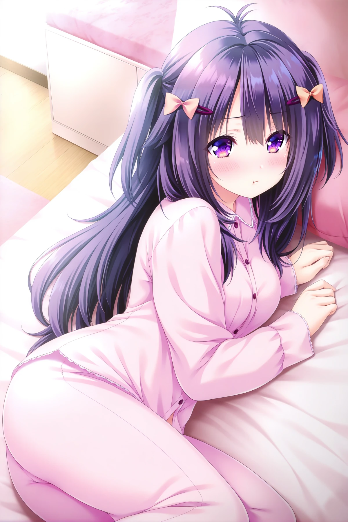 睡衣:ayane nightwear, pajamas,shirt, pink shirt, pink pants, black hair, long sleeves, pink pajamas, pants, dress shirt, blush, hair between eyes, purple hair, collared shirt,