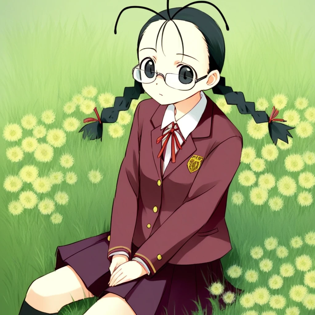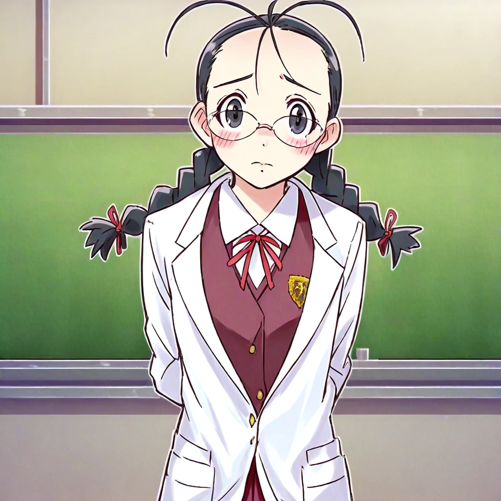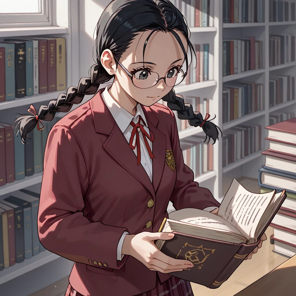 satomi_h, 1girl, black hair, twin braids, glasses, black eyes, school uniform, jacket, skirt