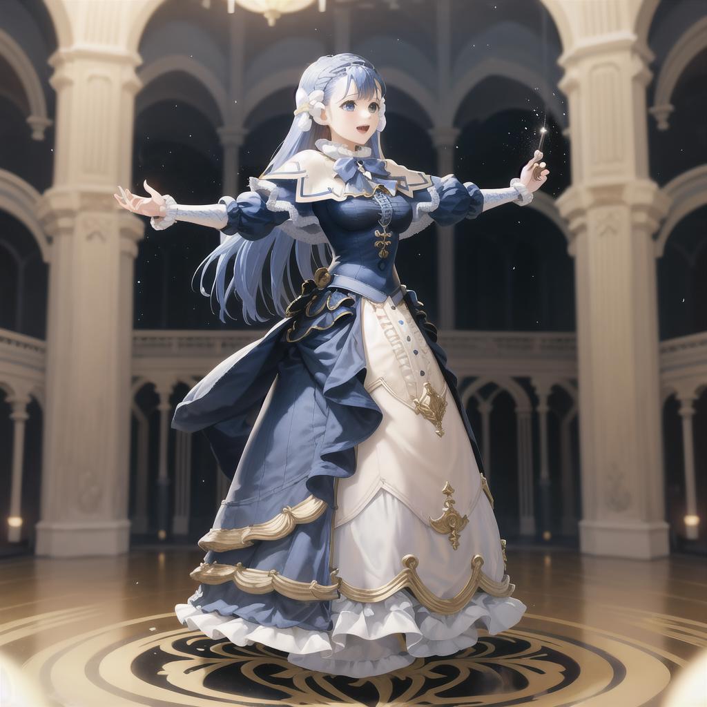 Alternative prompt: rinea fe, holding, jewelry, very long hair, standing, full body, frills, puffy sleeves, capelet, blue dress, blue bow, frilled dress, long dress,