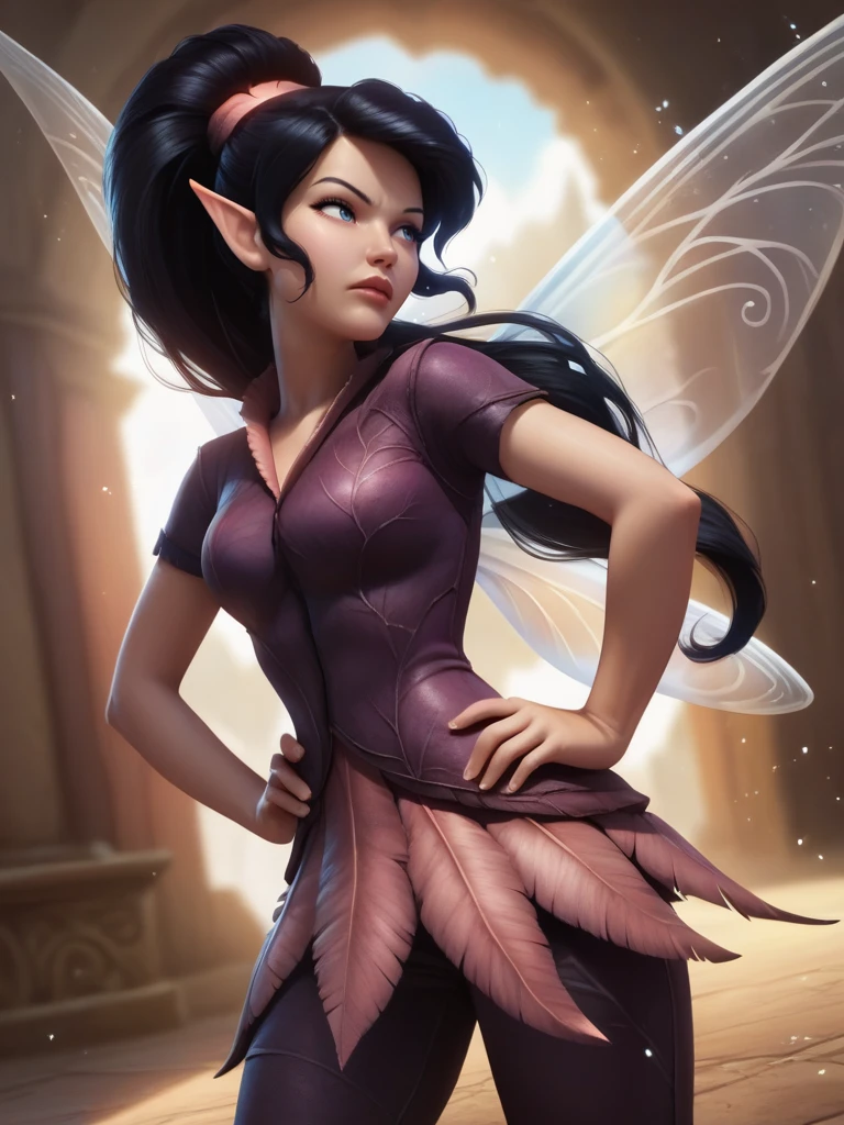 Outfit: "black hair, long hair, ponytail, blue eyes, fairy wings, fairy, pointy ears, purple dress, short sleeves, pants"