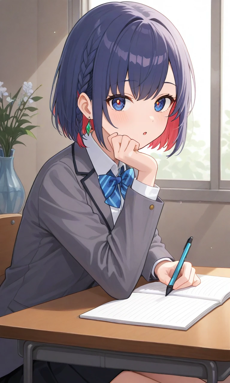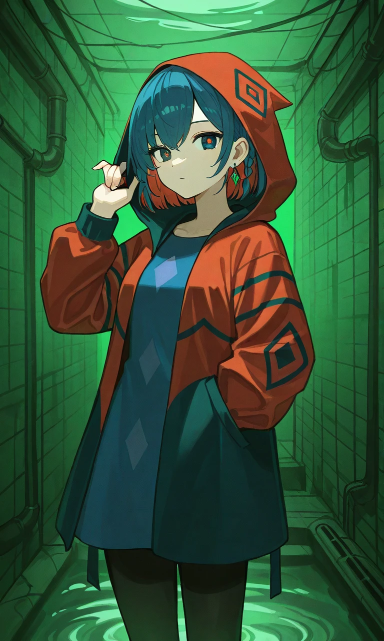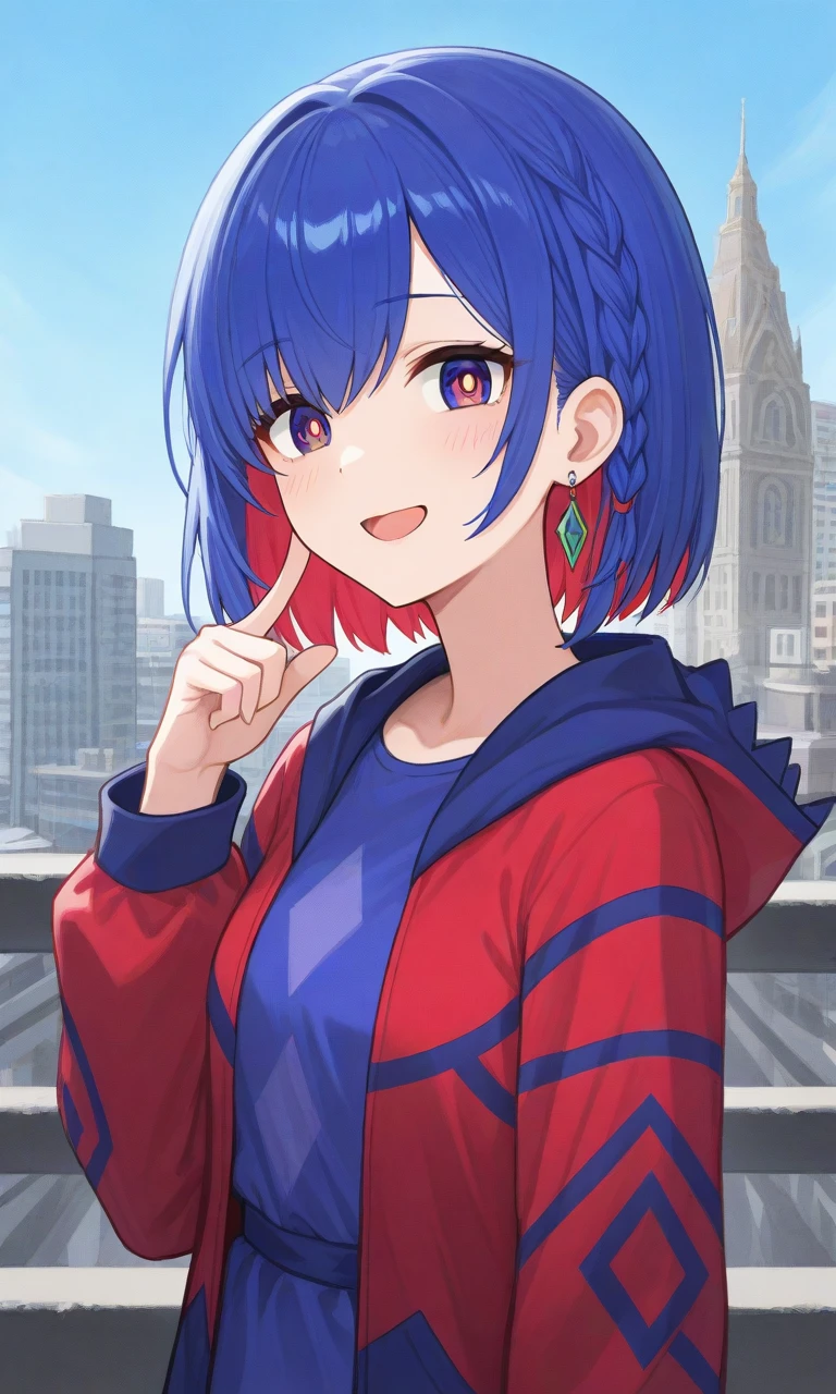r1m n1ghtw1ng, short hair, earrings, side braid, red jacket, multicolored jacket, hooded jacket, long sleeves, hood down, blue dress, black pantyhoseIf you want to improve hair accuracy, add