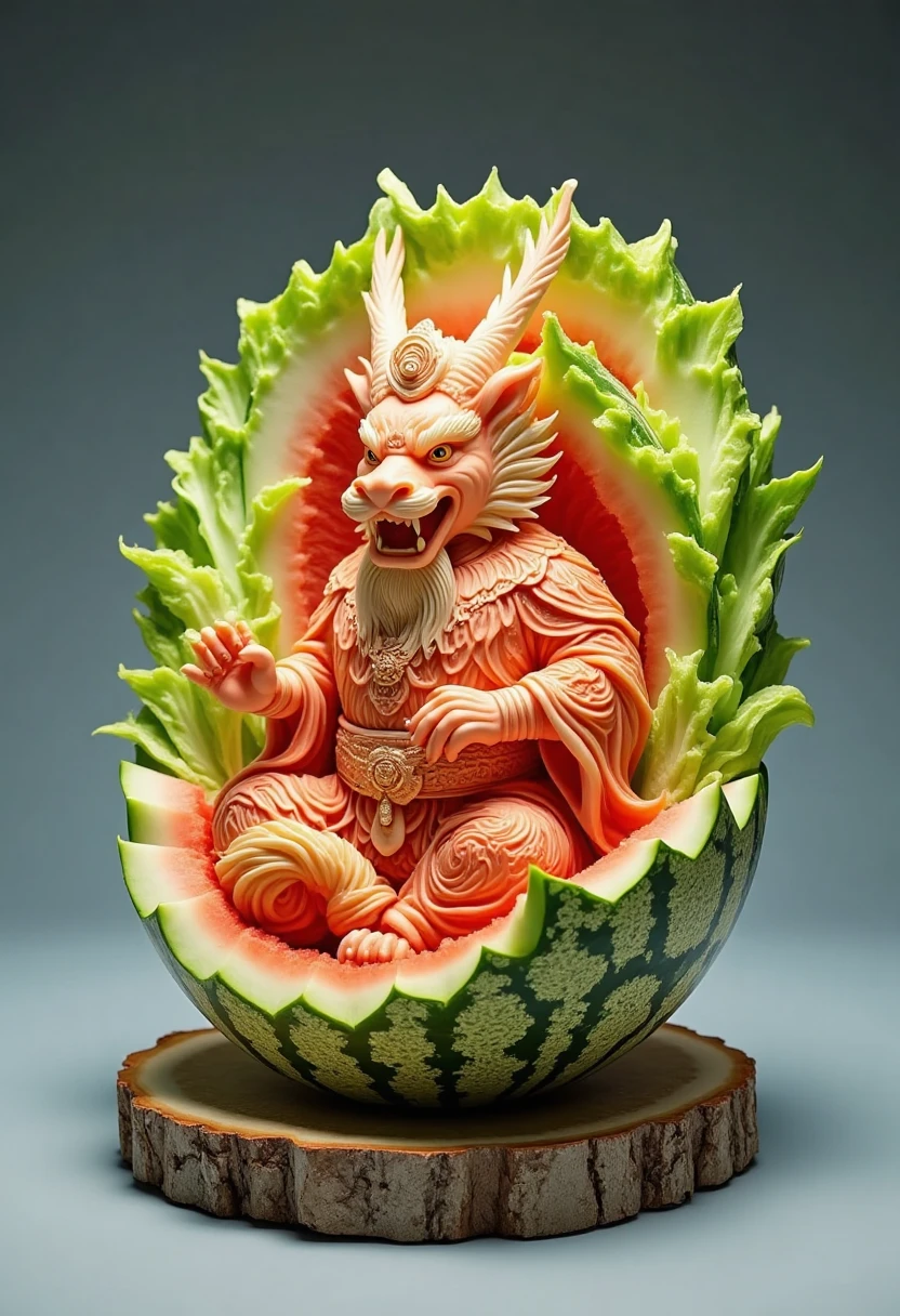 Food carving art combined with mythology, carve a Dragon King, take watermelon as material, show the power of controlling water.