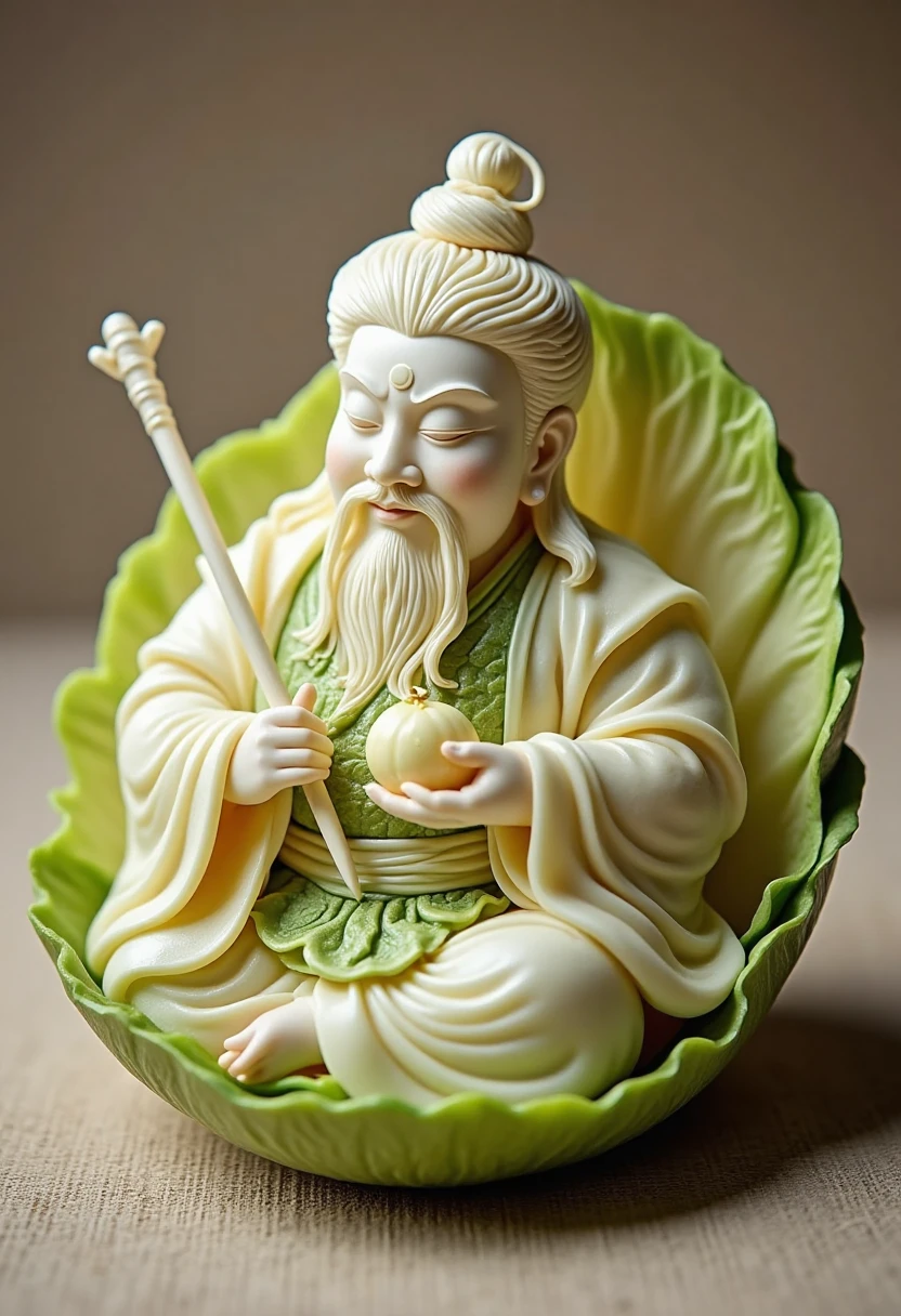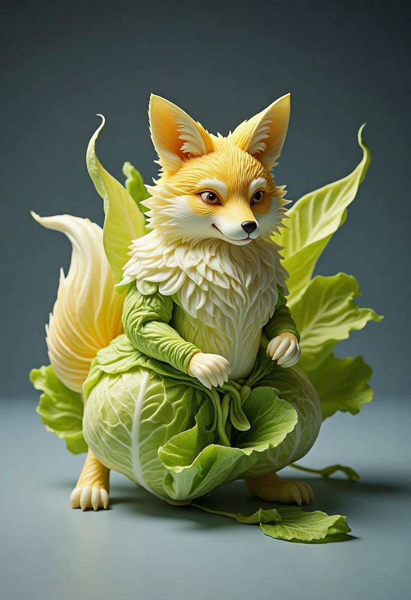 Food carving art combined with mythology, create a Fox Fairy, use radish and cabbage, show its enchanting and agile posture.