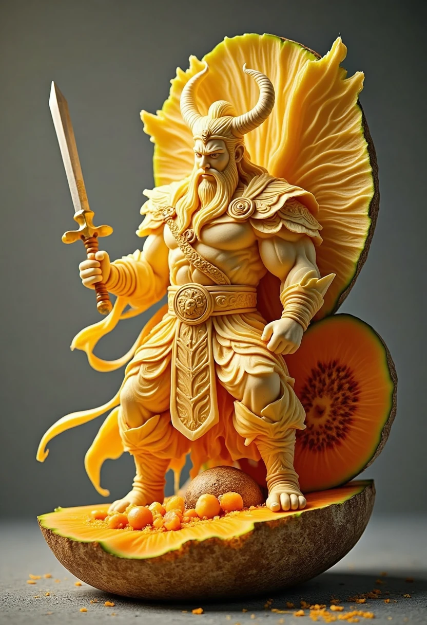 Food carving art combined with mythology, create a God of War, use potato as base, present the heroic and fearless momentum.