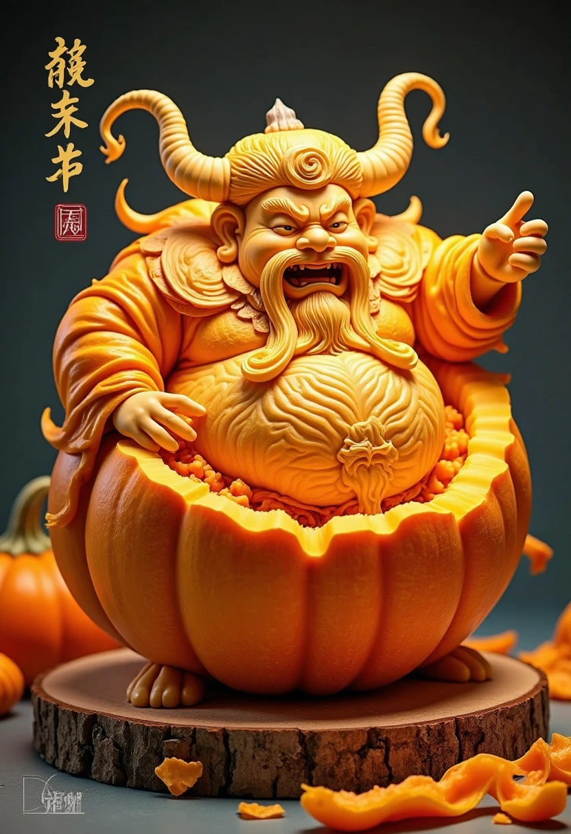 Food carving art combined with mythology, make a Zhu Bajie, use pumpkin to shape, highlight his funny and gluttonous features.