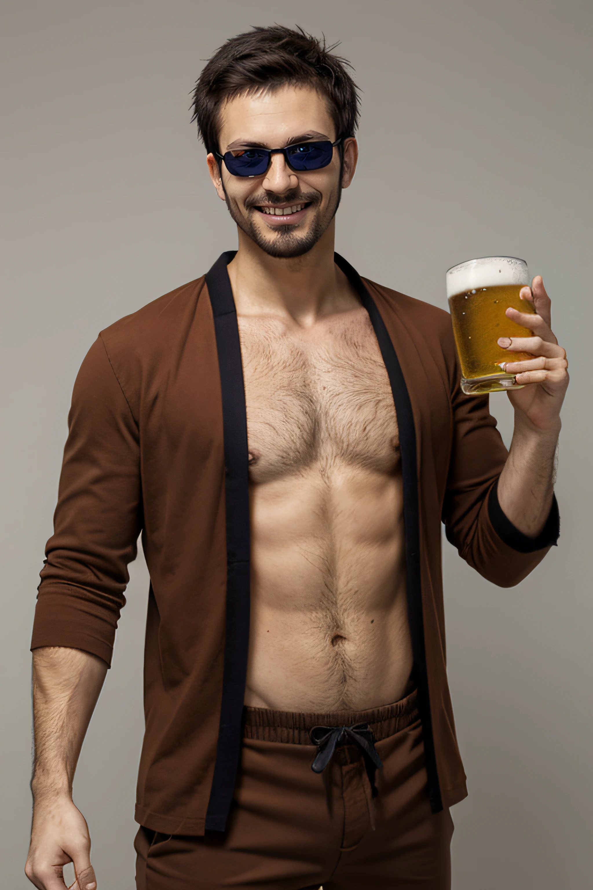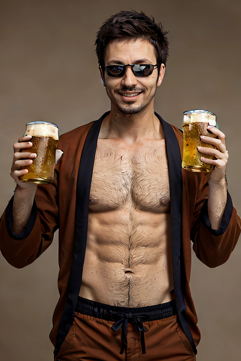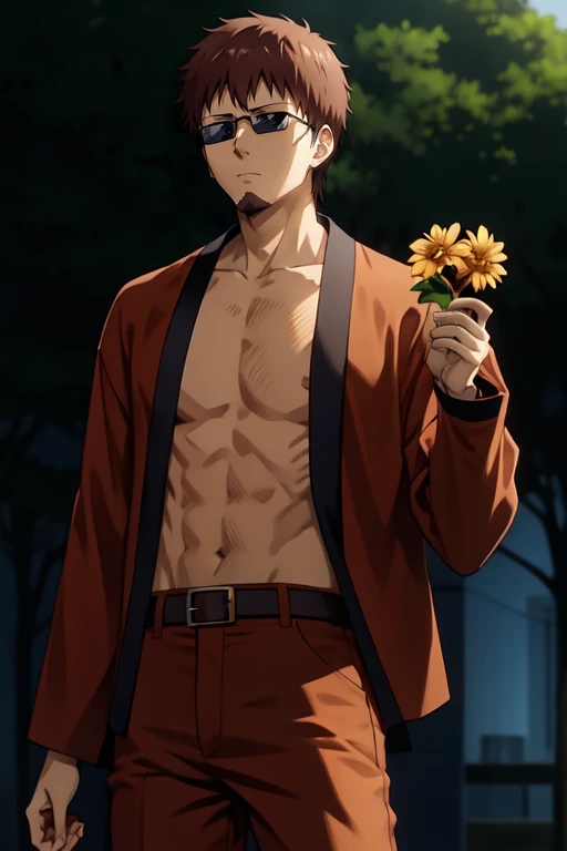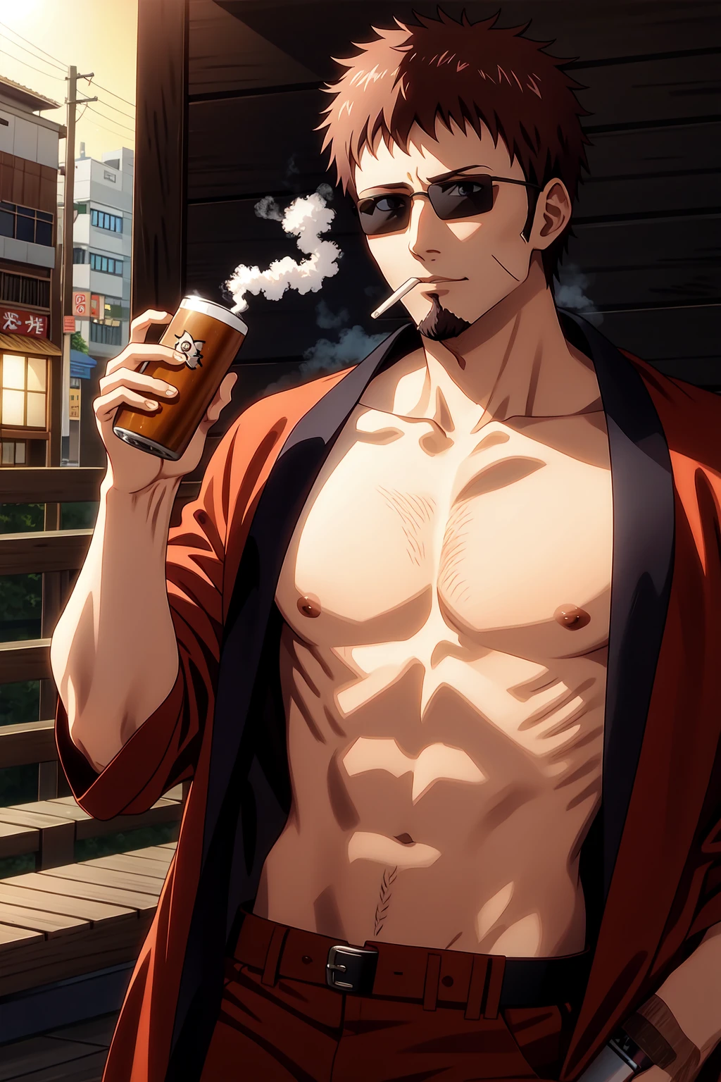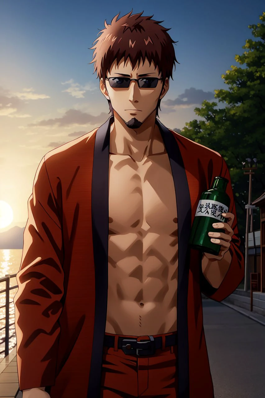 Help Promts: 1Man, Small Beard, Geta, , Brown Pants, Middle Aged, Brown Haori, Dark Glasses, Brown Hair, Short Hair, Japan, bare_belly.
