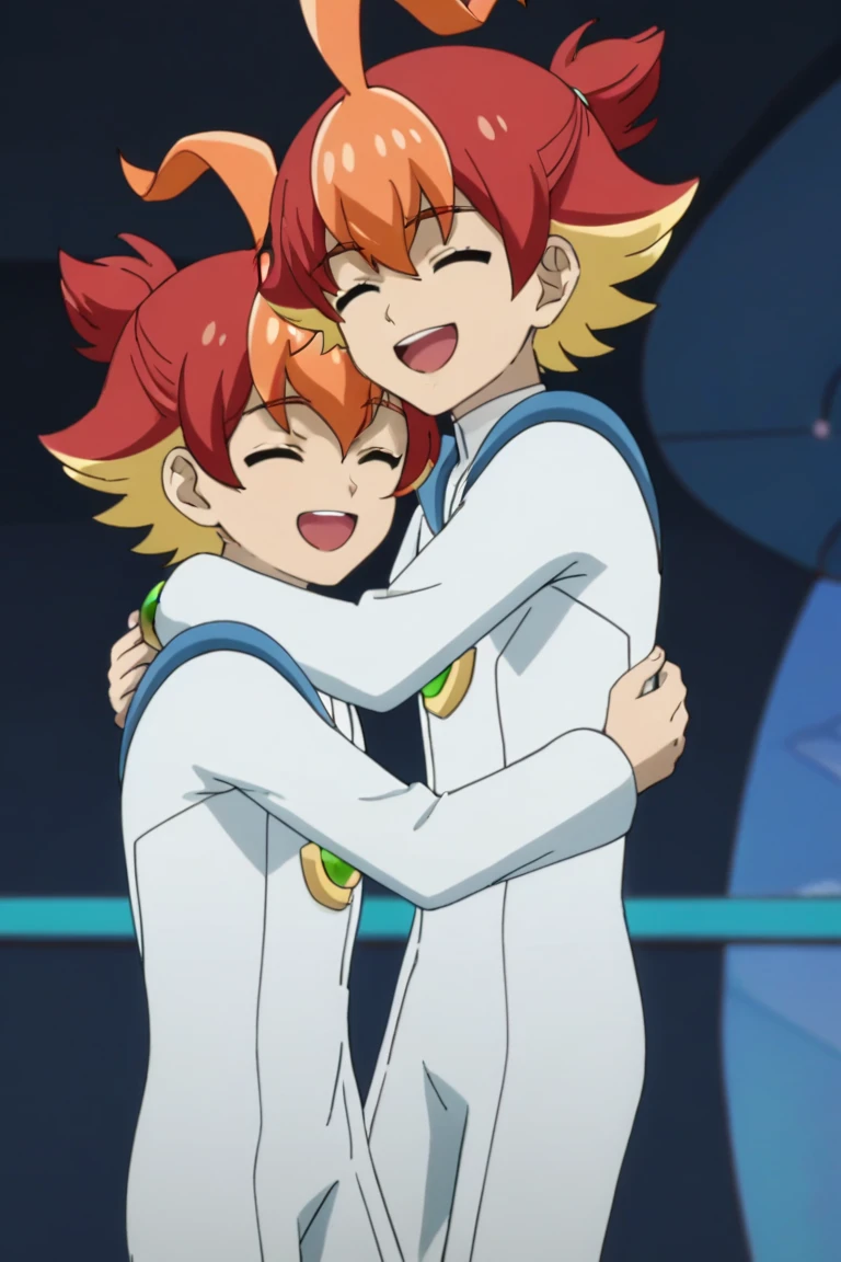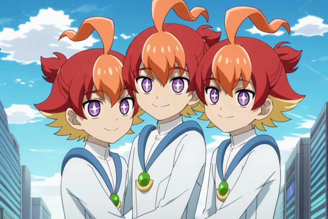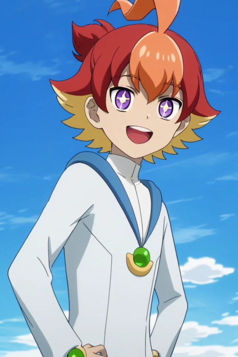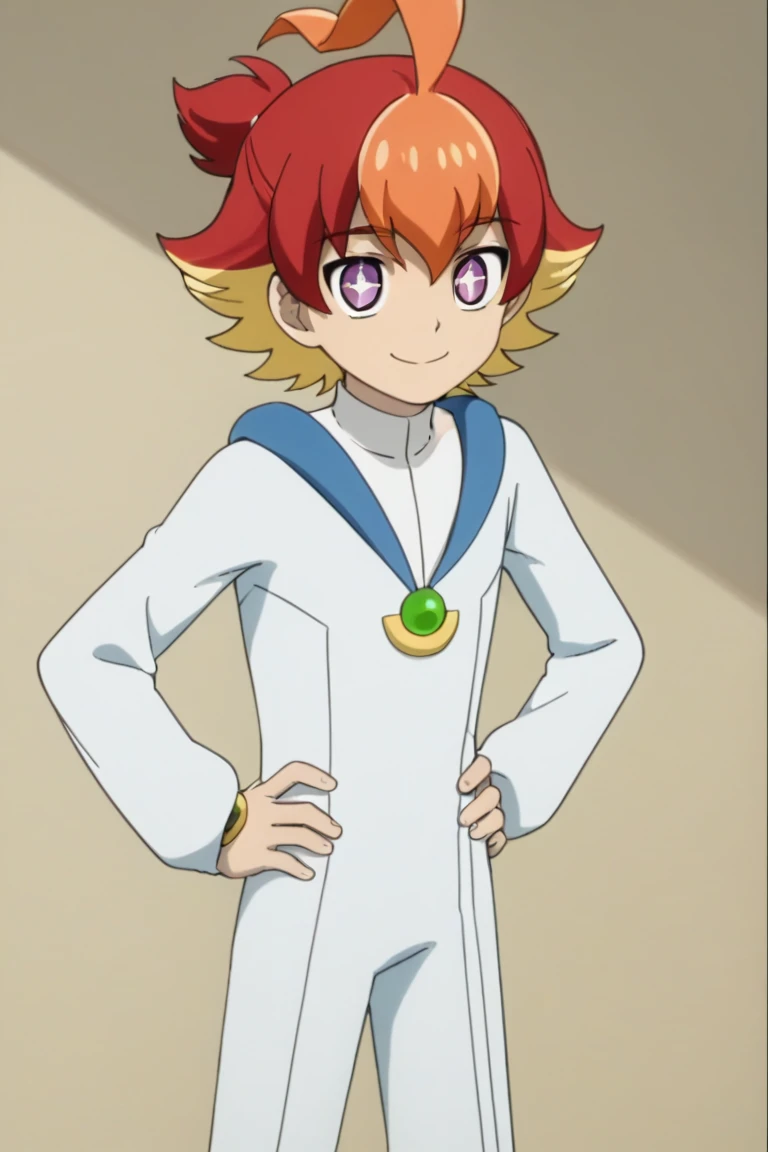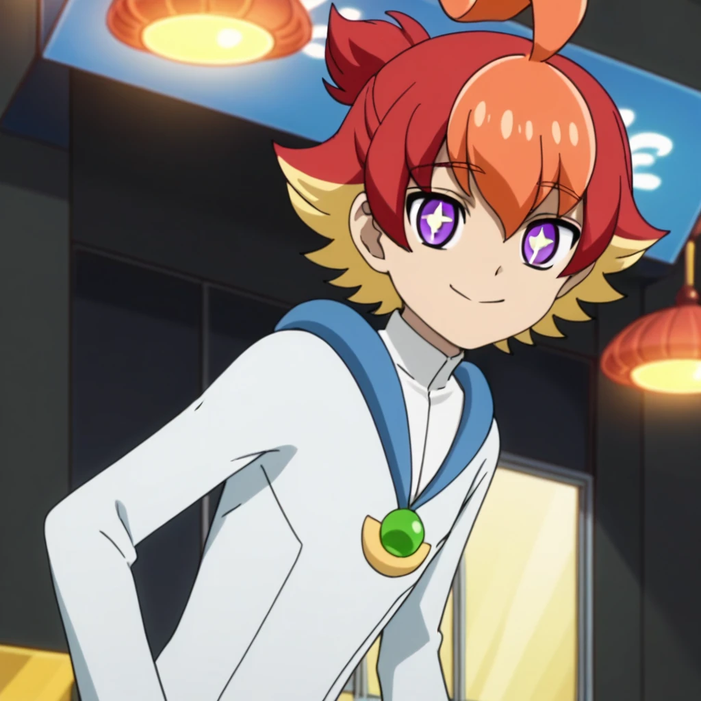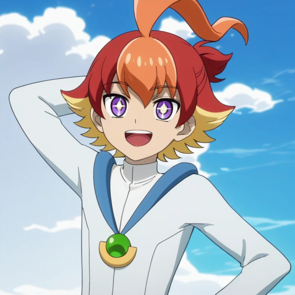Prompts: male, multicolored hair, three-tone hair, red hair, blonde hair, orange hair, ahoge, ponytail, purple eyes, cross-shaped pupils, + +, white bodysuit, jewelry, ankle cuffs, boots, indoors (bedroom/window/curtains), indoors (market), indoors (factory), indoors (spaceship), outdoors (town), outdoors (city/sky/cloud/building - for Velgear), outdoors (forest/nature)