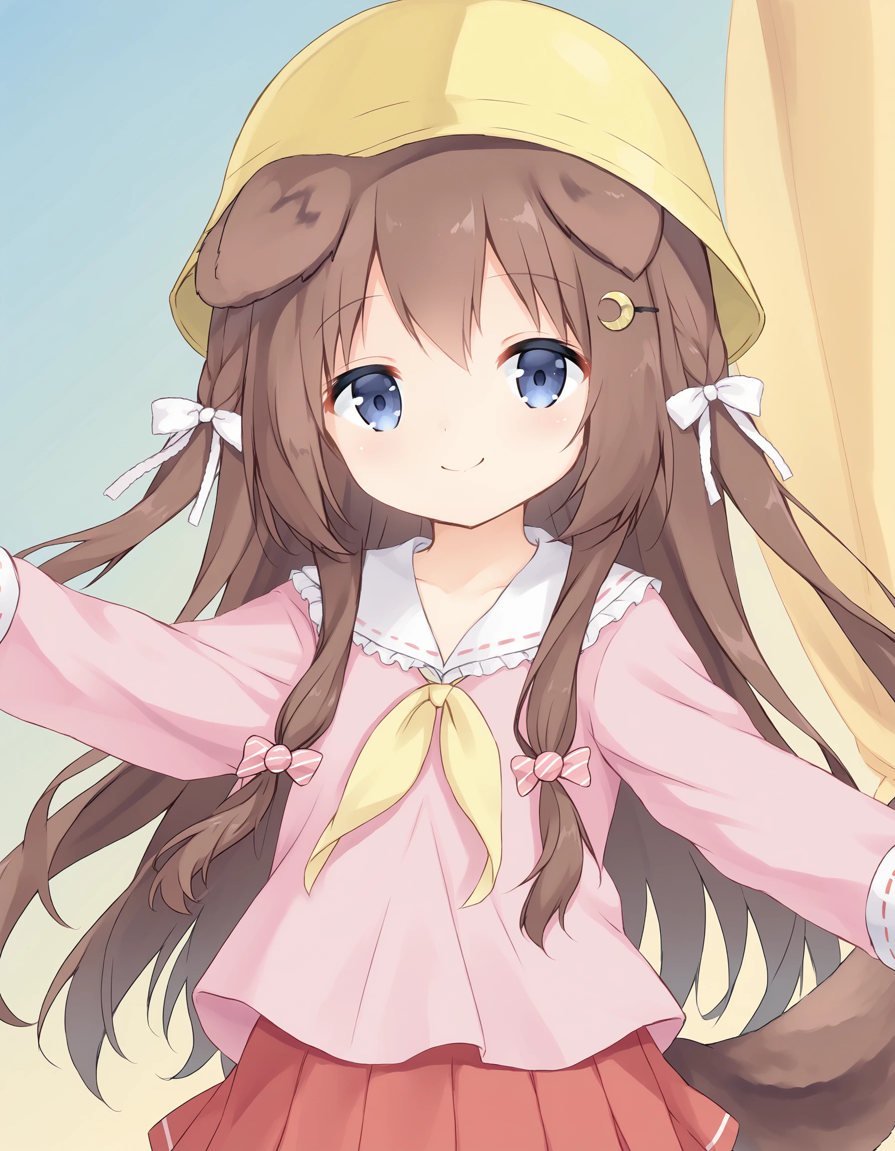 fumizuki \(kindergarten\) \(azur lane\), school hat, crescent hair ornament, pink shirt, yellow neckerchief, red skirt, white pantyhose, dog tail