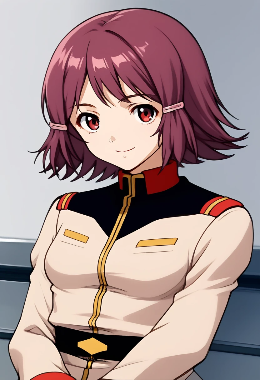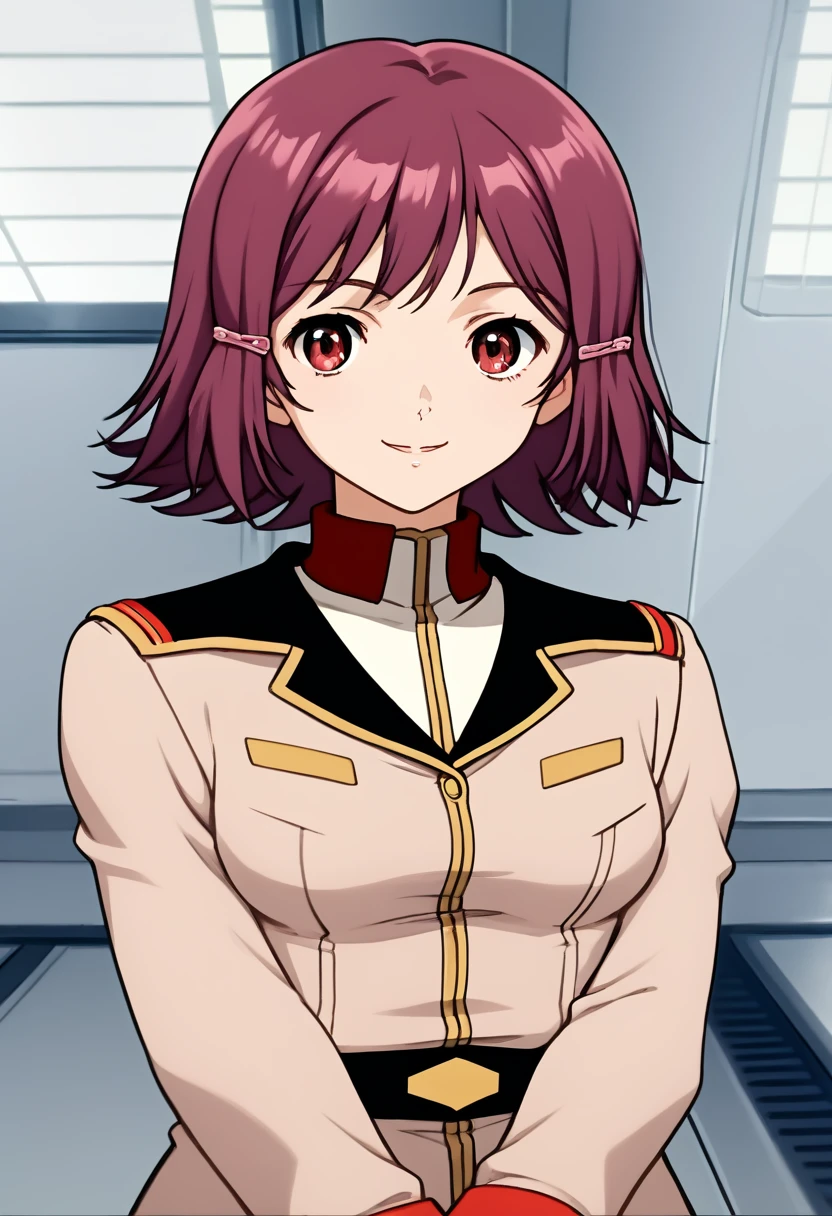 Ellen Rocifer, red eyes, short hair, purple hair, hair ornament, uniform,