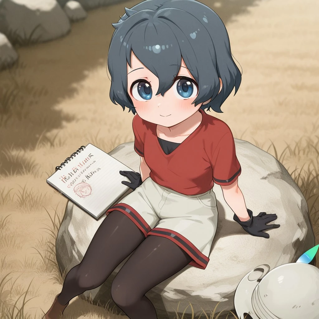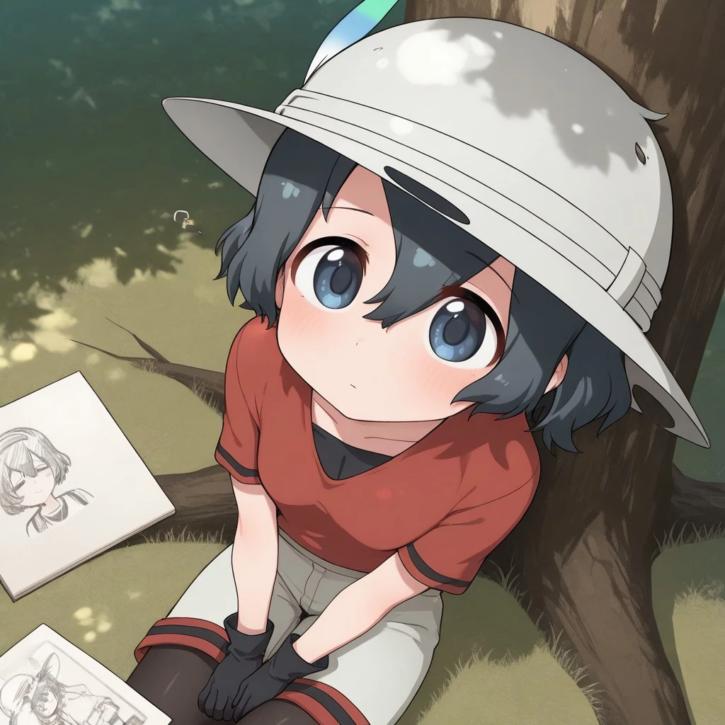 Prompts: black hair, blue eyes, pith helmet, red shirt, backpack, black gloves, shorts, black pantyhose, shoes,