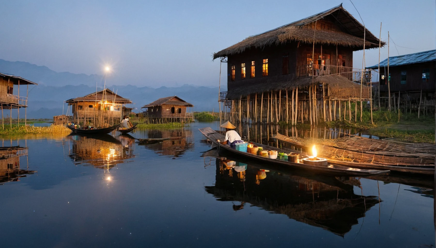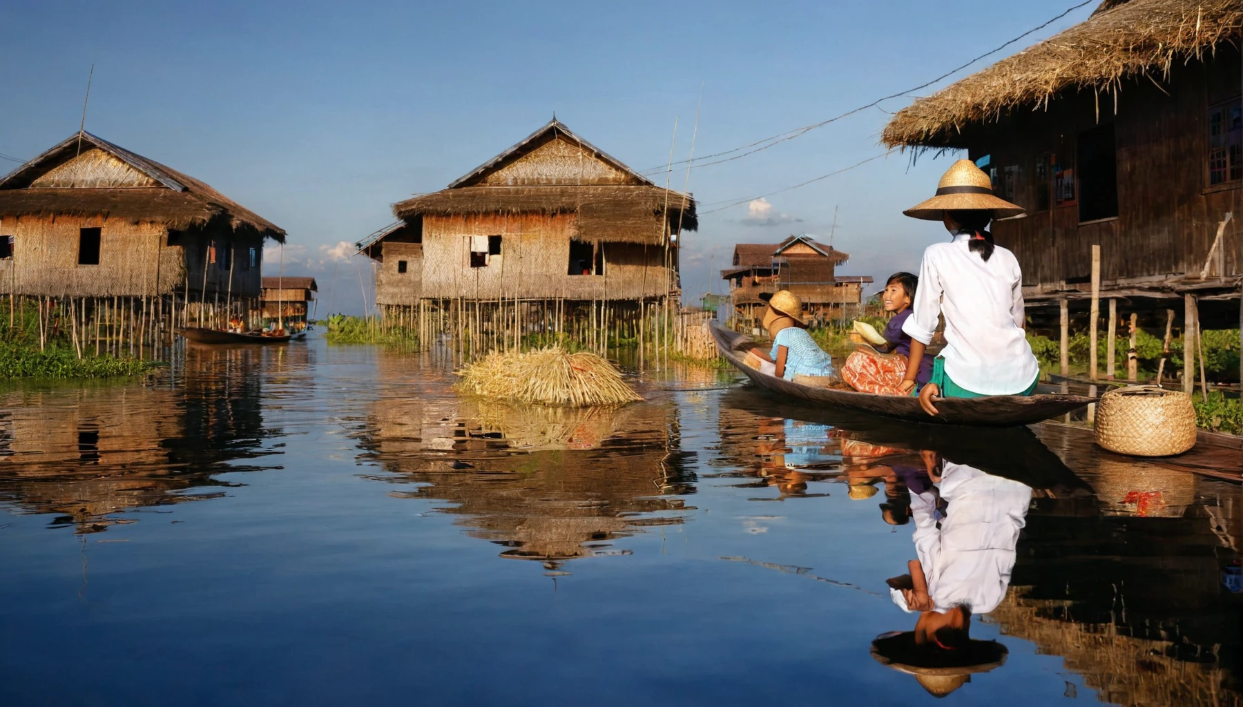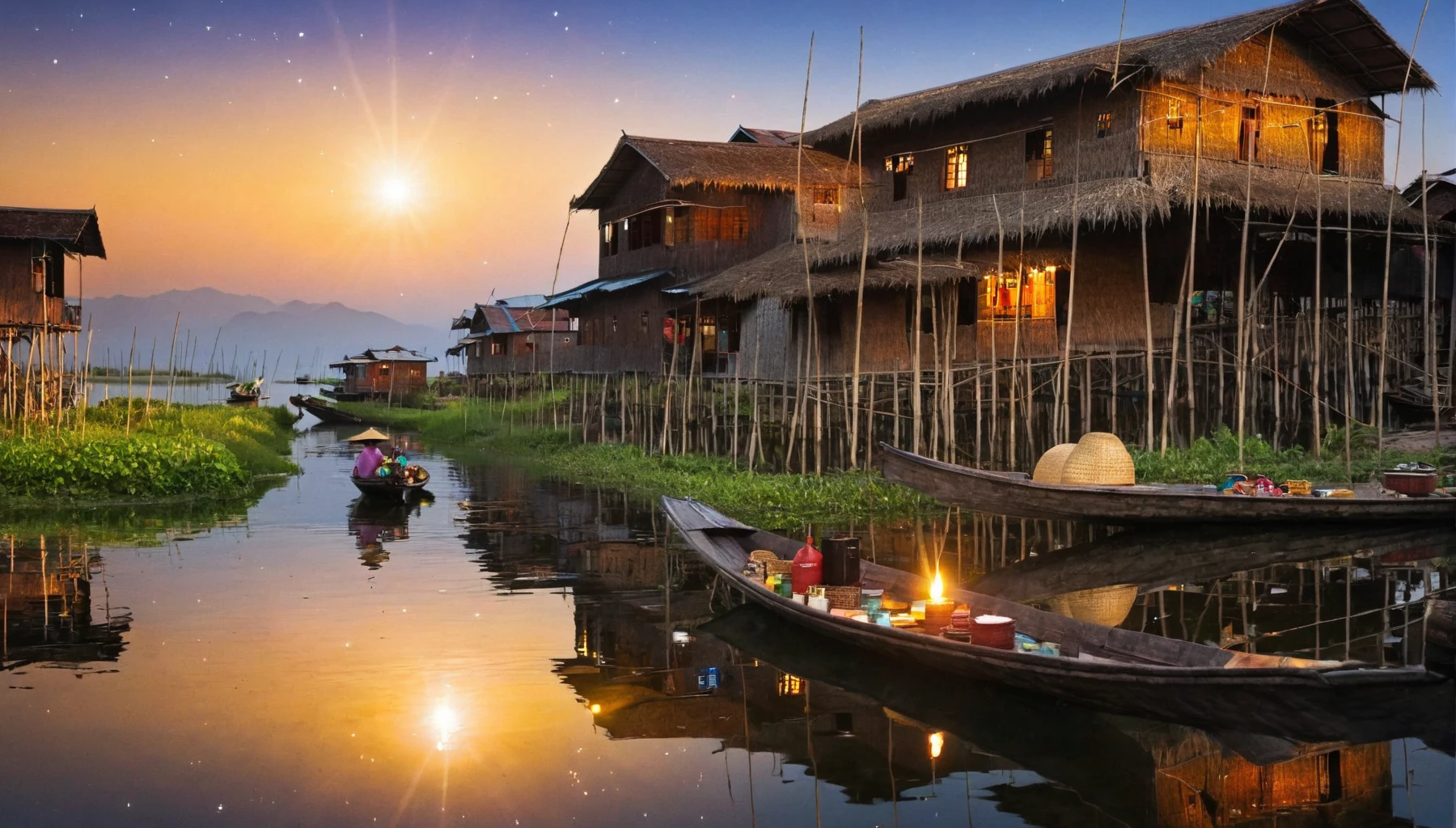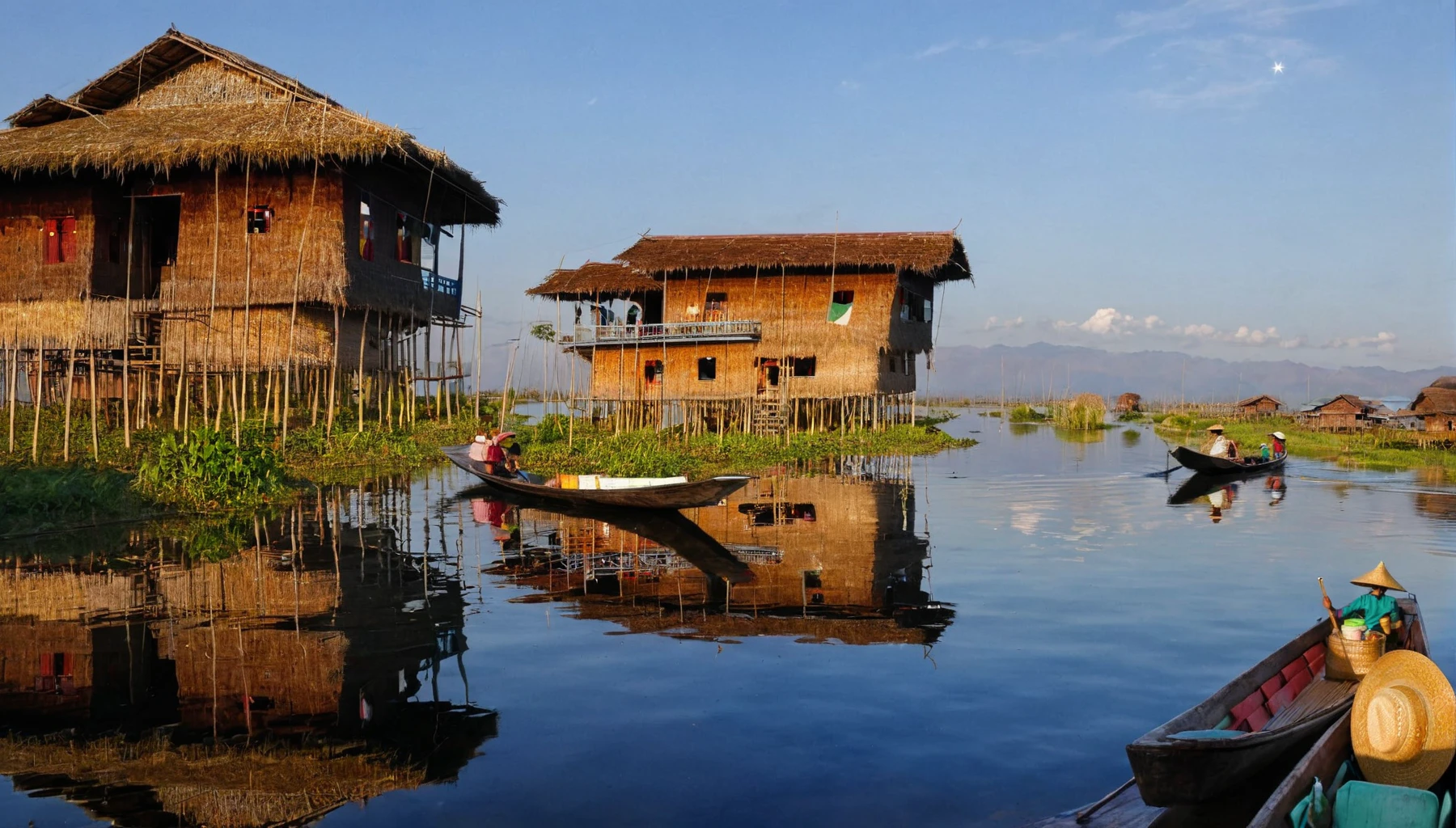 Inle Lake is in the Shan Hills of Myanmar. At its southwestern edge, Phaung Daw Oo Paya is a tiered pagoda with gilded Buddha statues. In the hills, near the market town of Indein, the stupas of Shwe Inn Dein Pagoda resemble a field of gold spires. The ruined stupas at nearby Nyaung Ohak have been reclaimed by forest. Maing Thauk village is split between land and water, with a wooden bridge connecting the two halves.