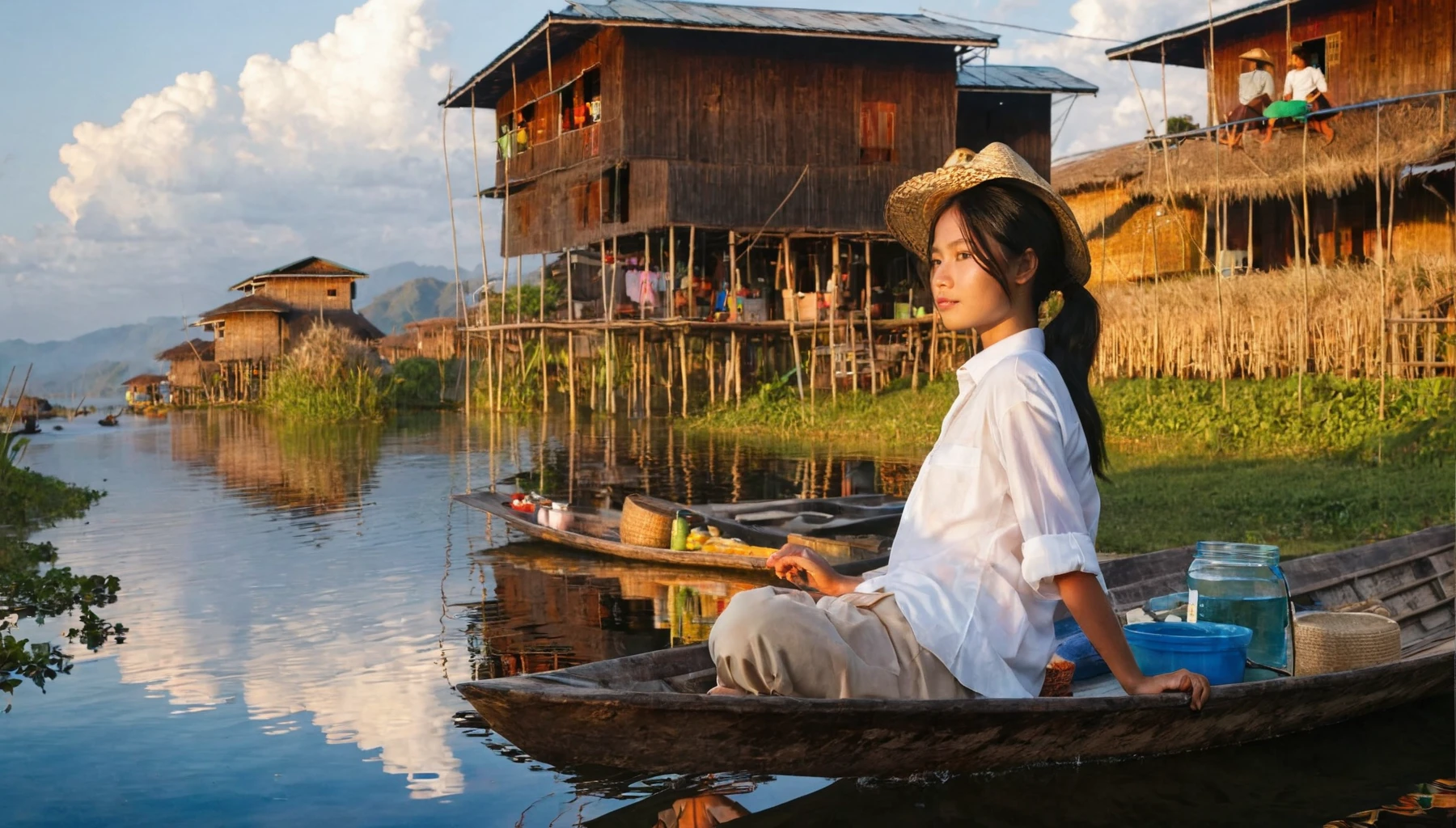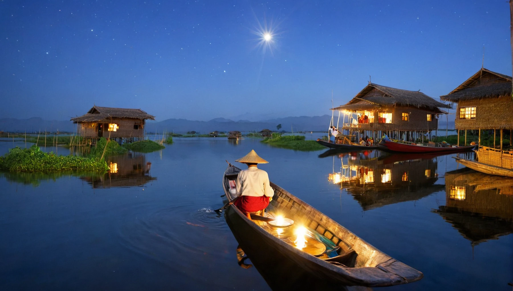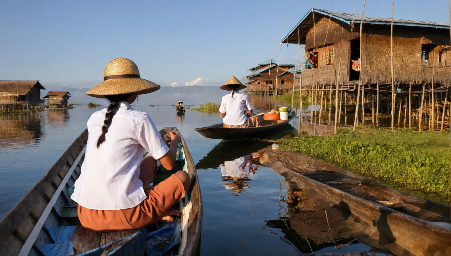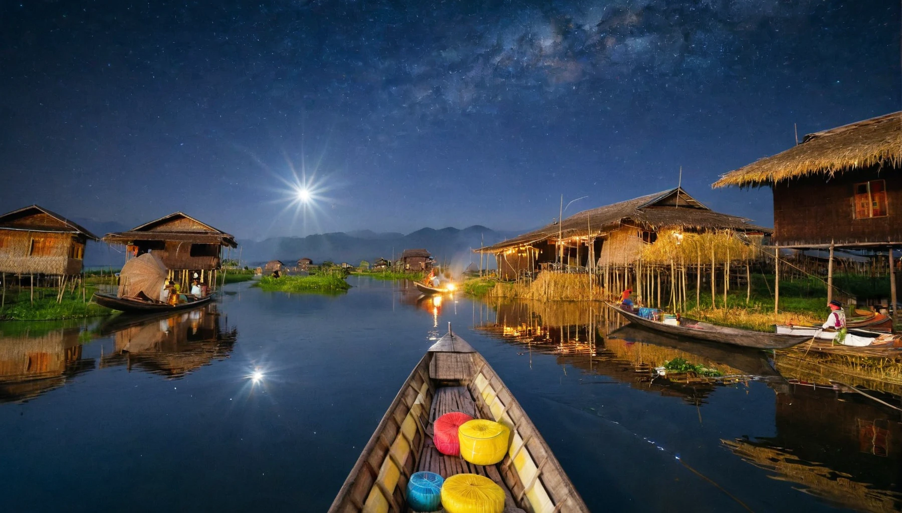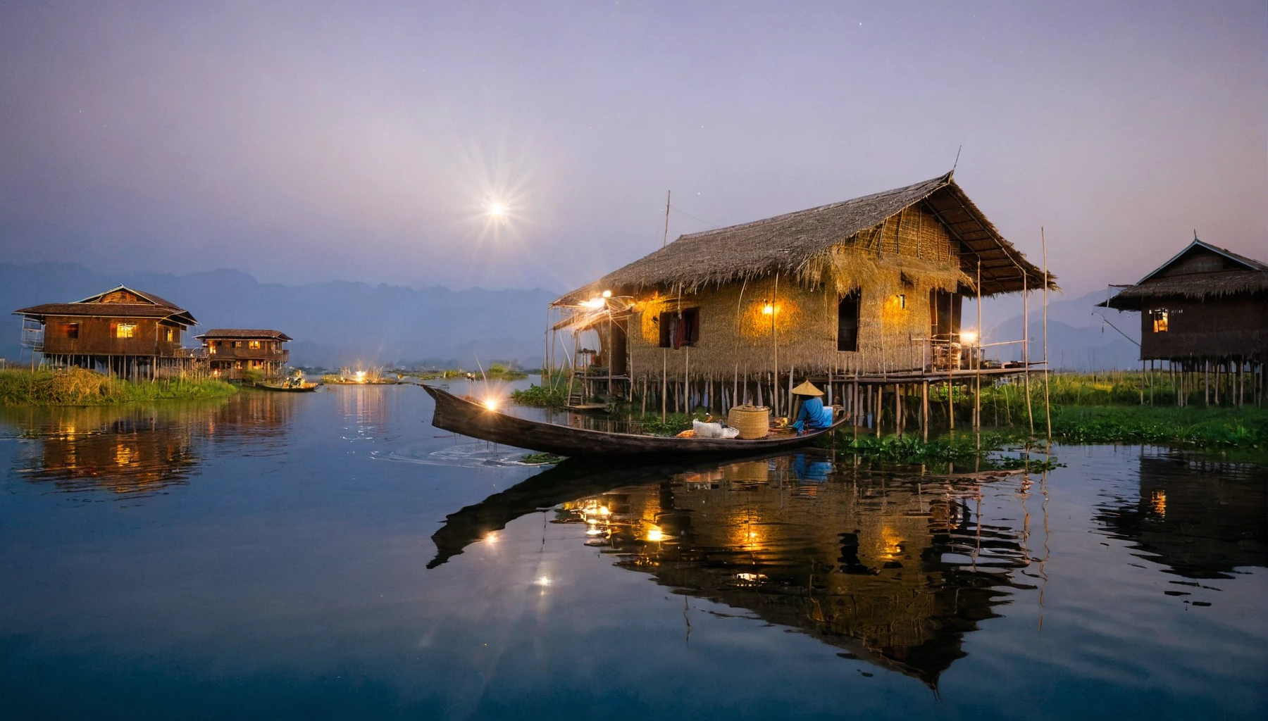 Inle Lake is in the Shan Hills of Myanmar. At its southwestern edge, Phaung Daw Oo Paya is a tiered pagoda with gilded Buddha statues. In the hills, near the market town of Indein, the stupas of Shwe Inn Dein Pagoda resemble a field of gold spires. The ruined stupas at nearby Nyaung Ohak have been reclaimed by forest. Maing Thauk village is split between land and water, with a wooden bridge connecting the two halves.