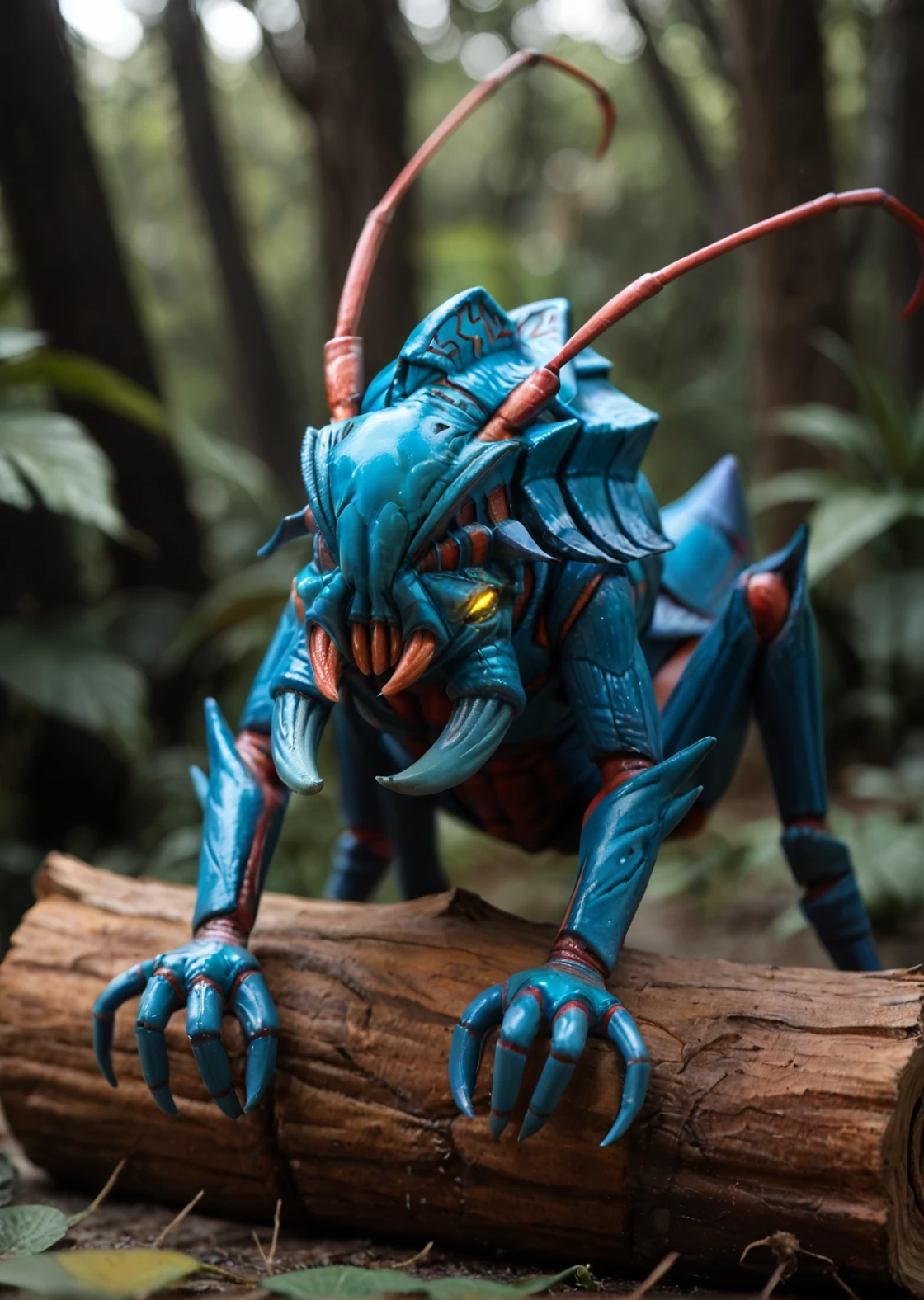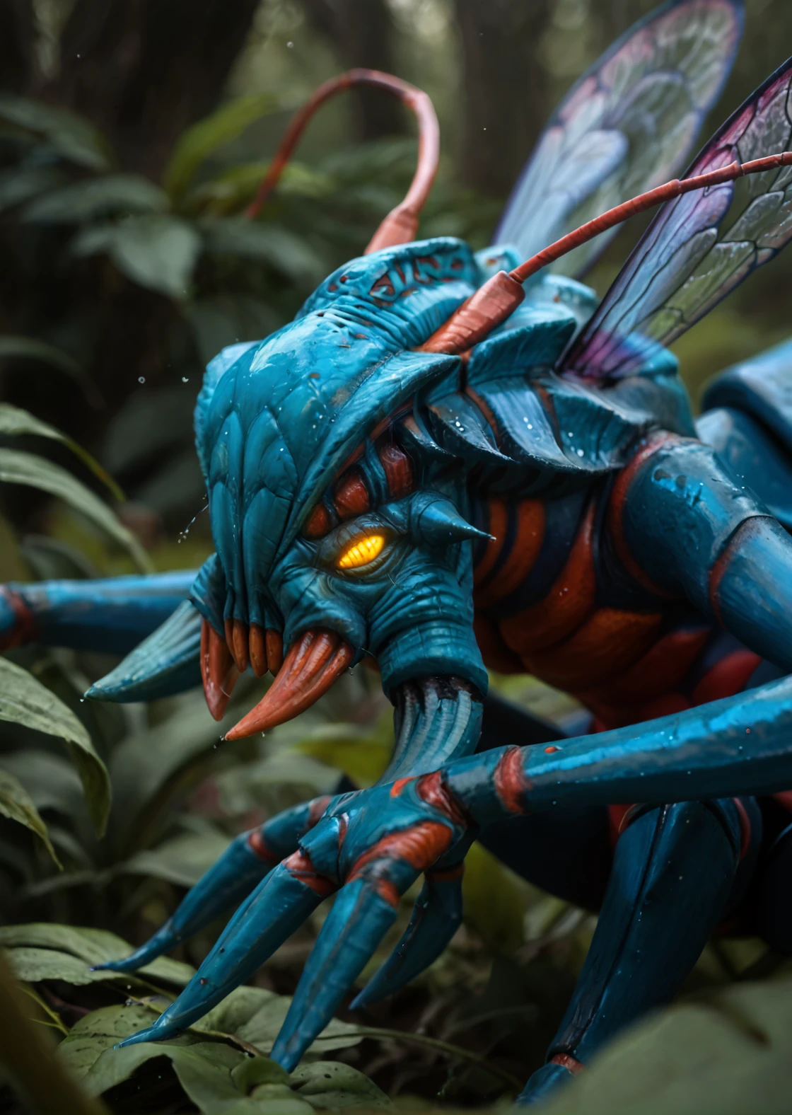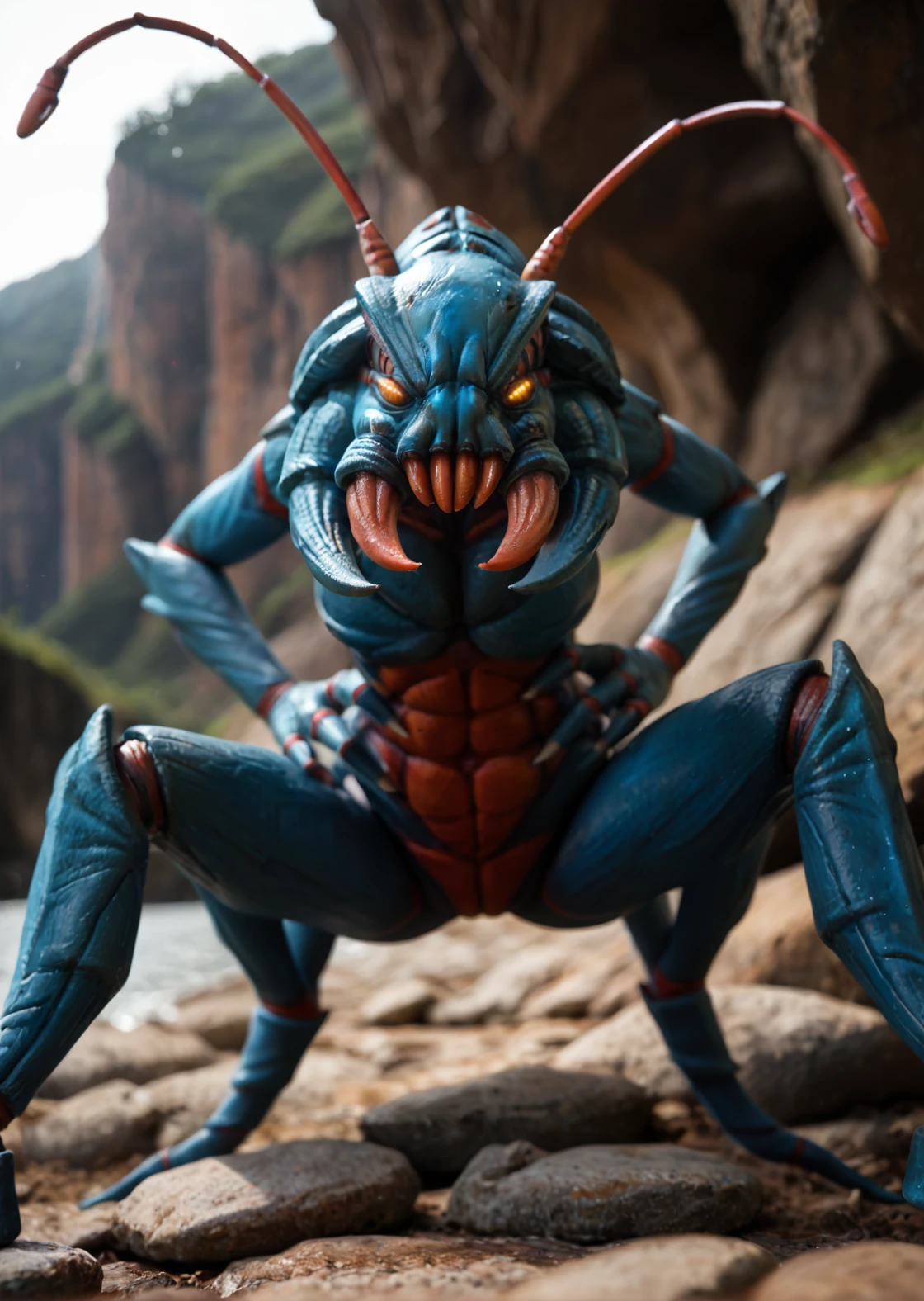 spikes, antennae, two antennas in the head, blue skin, colored skin, shiny skin arthropod limbs, extra arms, multiple legs