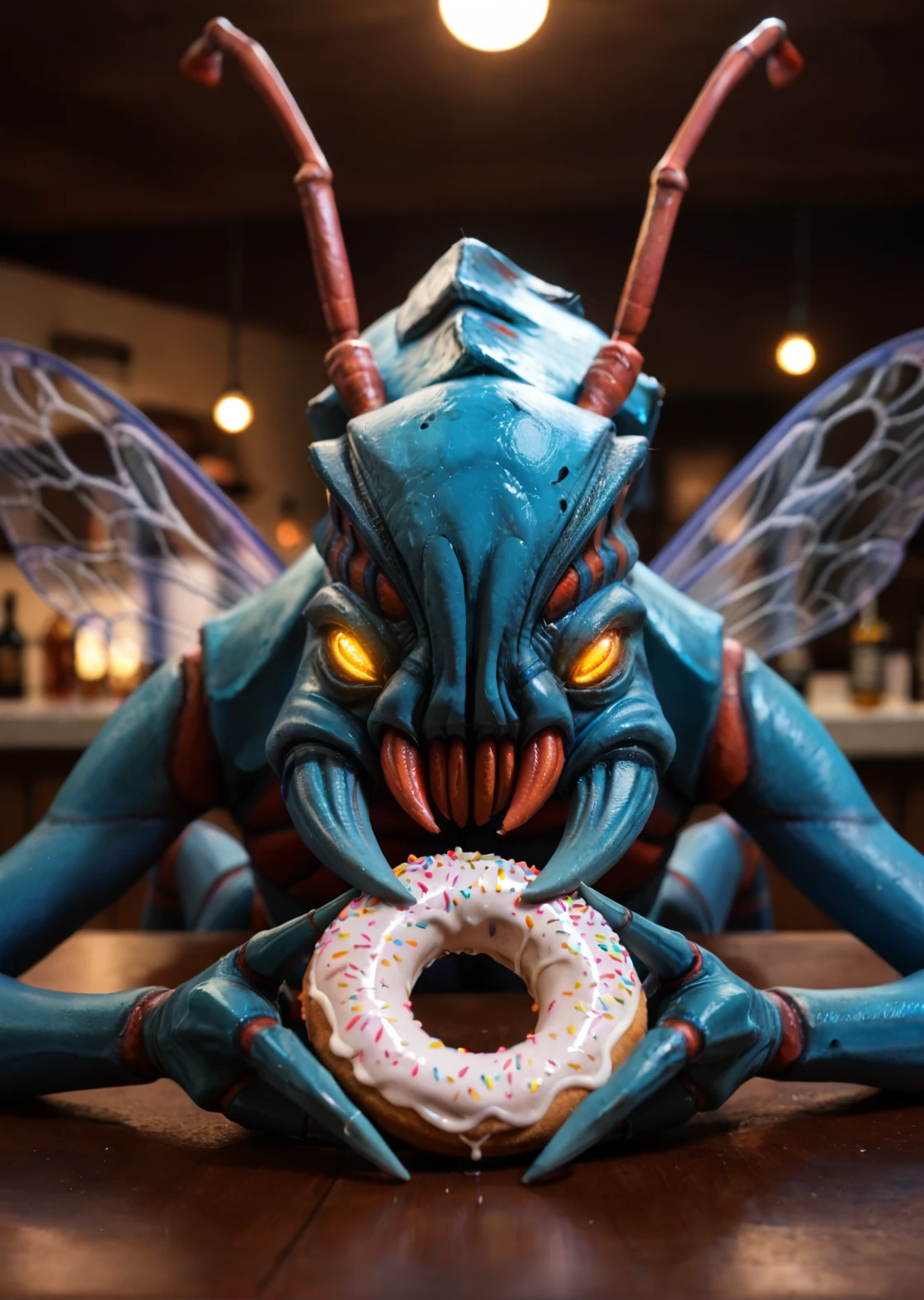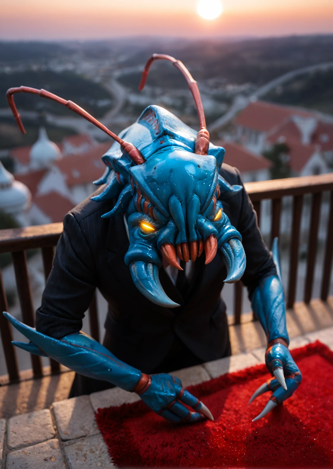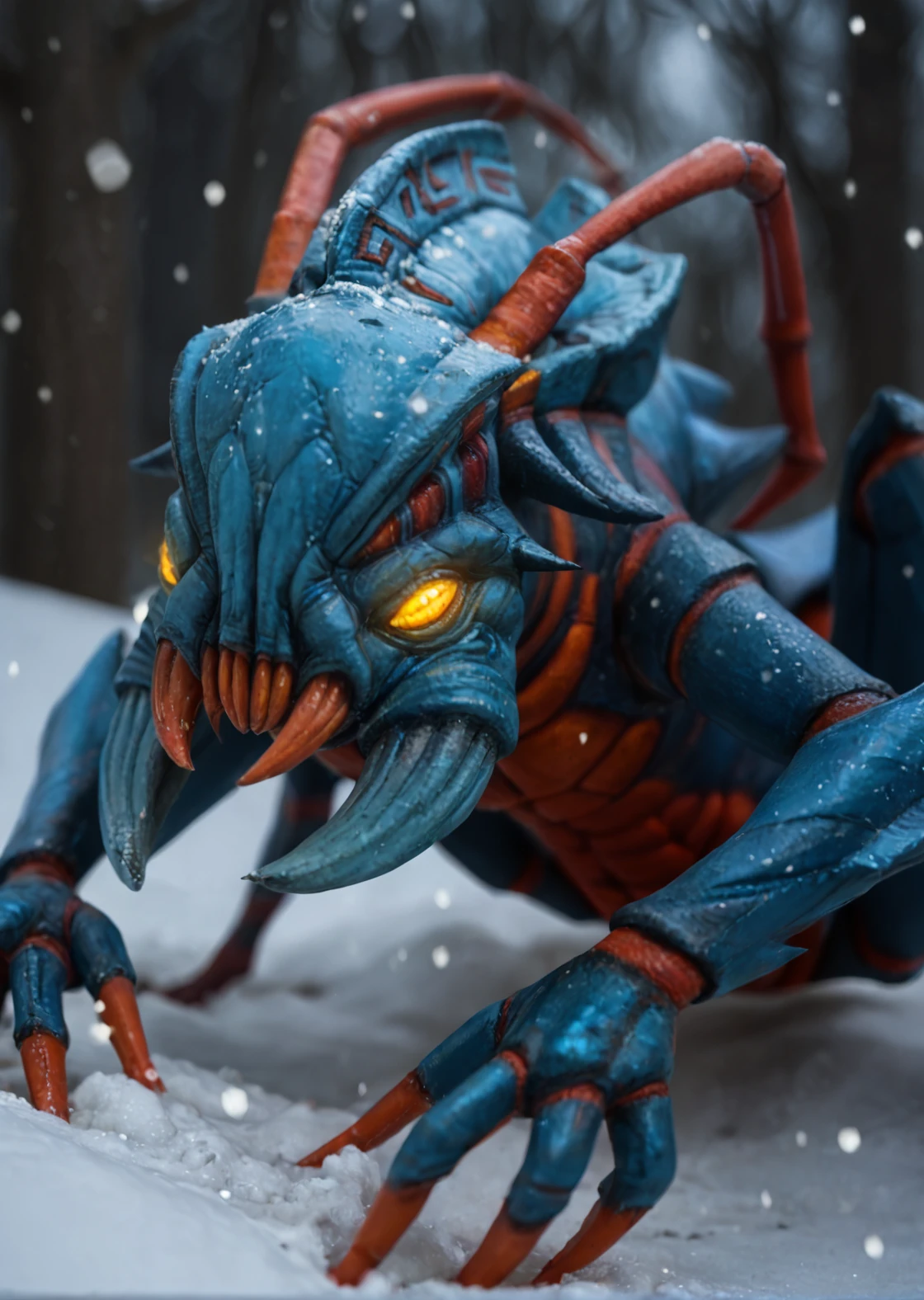spikes, antennae, two antennas in the head, blue skin, colored skin, shiny skin arthropod limbs, extra arms, multiple legs