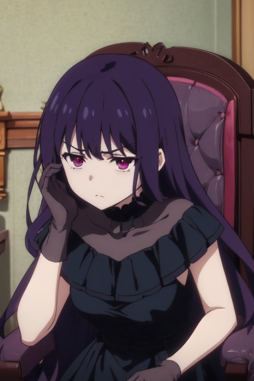 tensei oujo to tensai reijou no mahou kakumei anime lineart, 1girl, solo tilty claret, purple eyes, dark purple hair, black choker, black dress, long dress, black gloves, black bowtie