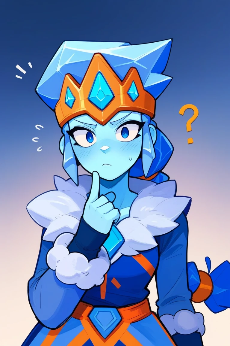 1 Girl, Blue hair, Low Braid, Tiara, Blue Dress, Fur Trim, Blue Eyes, Scepter, Solo, Blue skin , blush , confused , looking_at_viewer