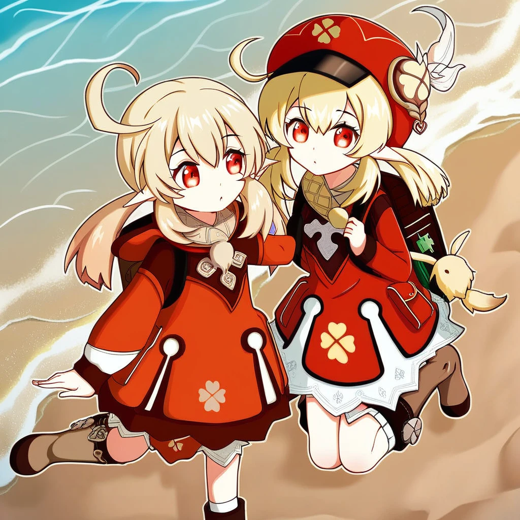 (Genshin_Klee, long hair, twintails, blonde hair, ahoge, bangs, hair between eyes, red eyes, pointy ears, long sleeves, backpack, hat, boots, dress),