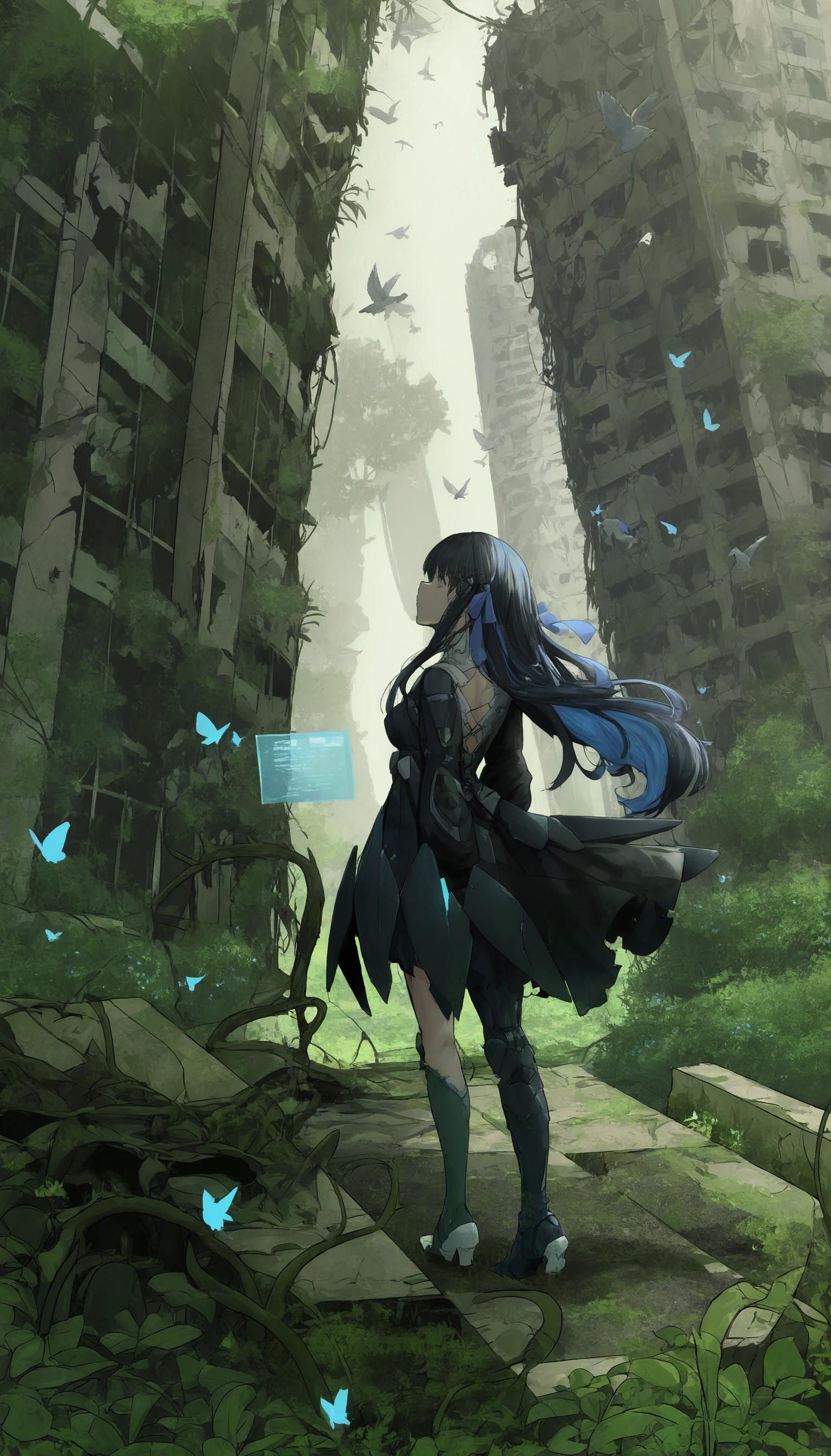 backless dress(If you want view from behind), armor(Optional), skeleton(If you want view from front side), single mechanical leg, blue ribbon, black hair, blue hair, long hair, purple eyesDescription